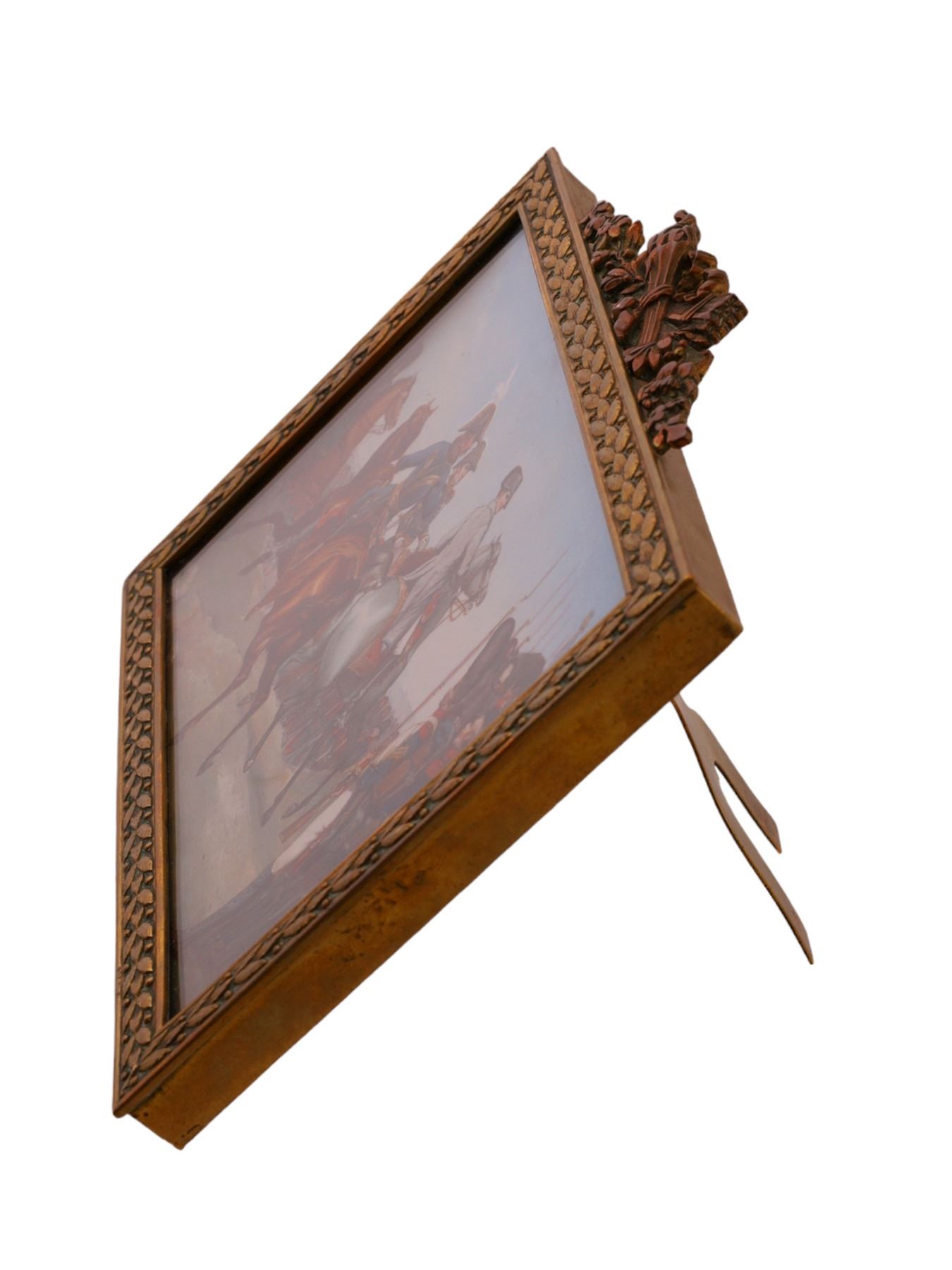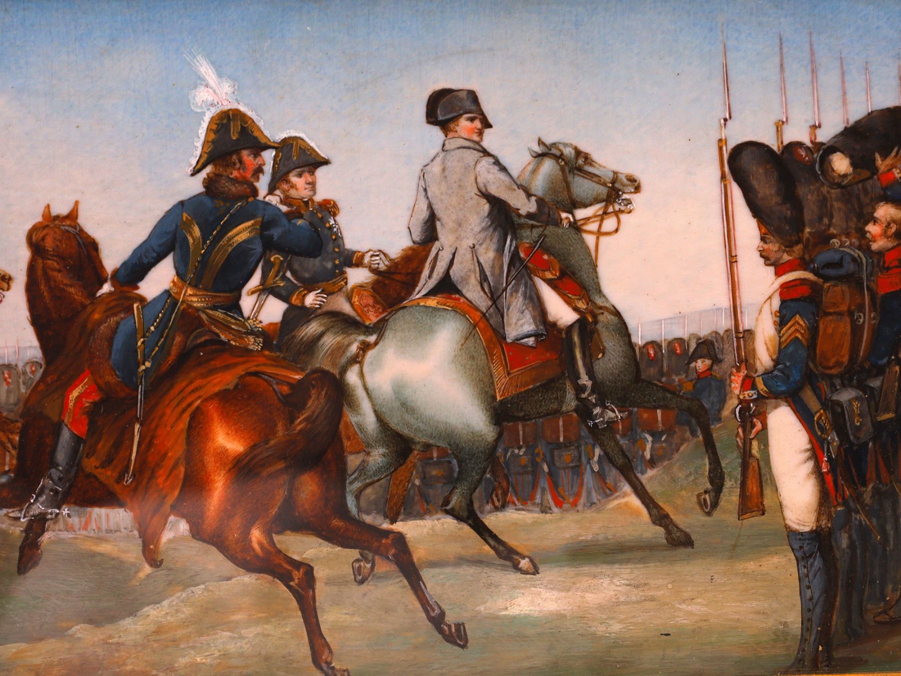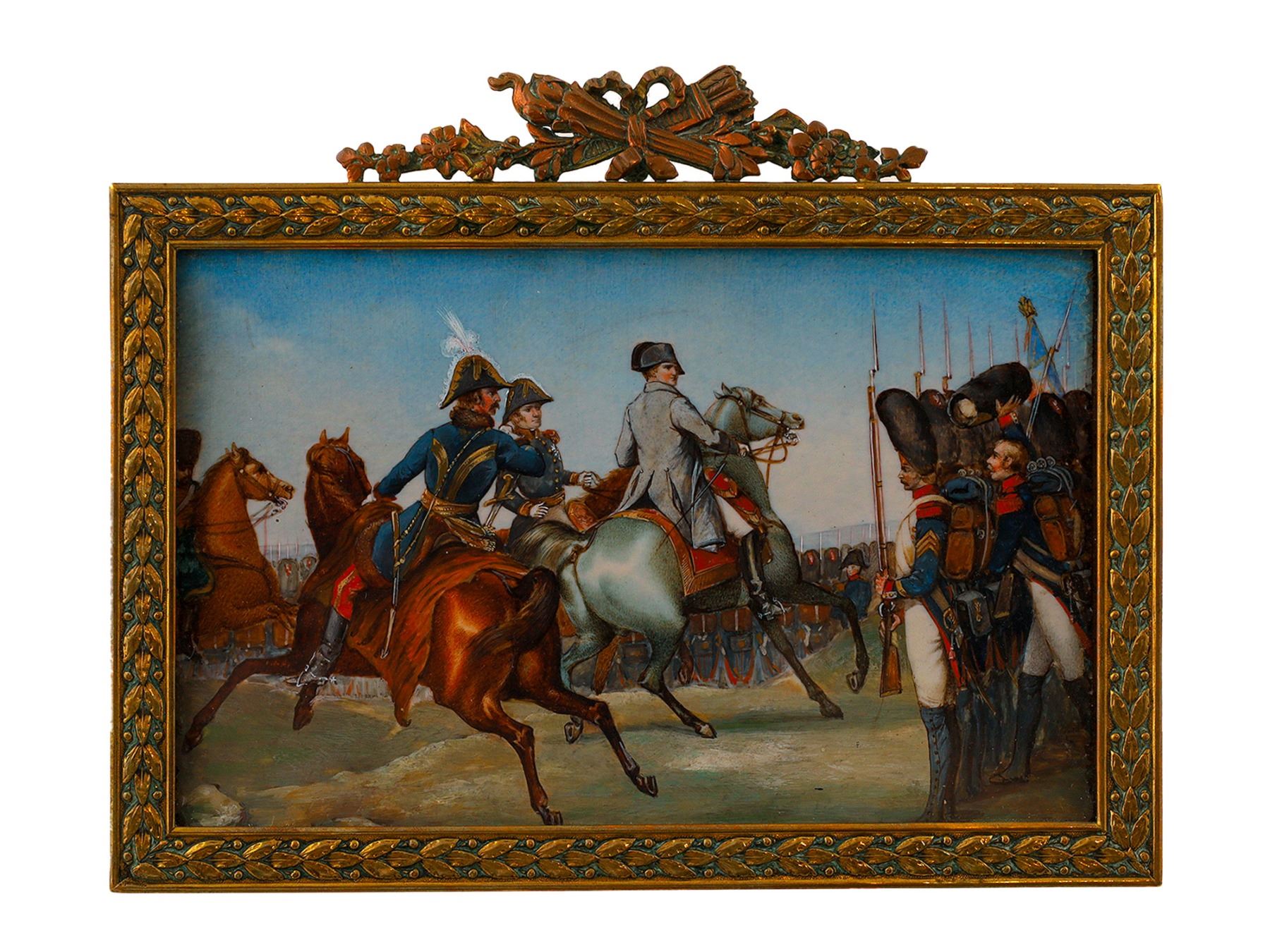 A fine watercolor miniature painting from the period depicting mounted Napoleon with his staff at a battlefield in its original cast-brass frame.
