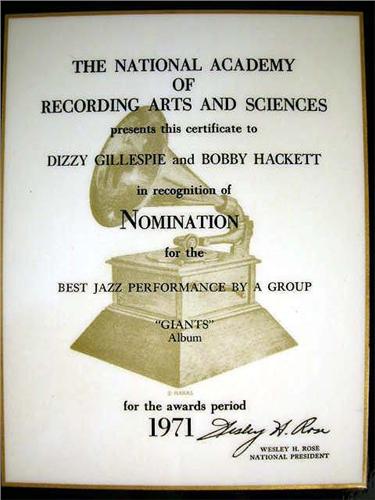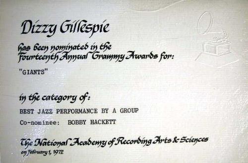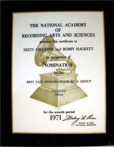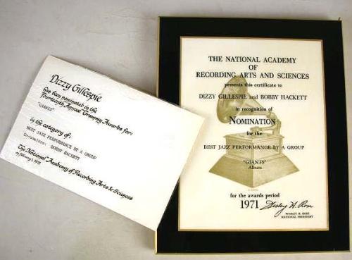 A NATIONAL ACADEMY OF RECORDING ARTS AND SCIENCES GRAMMY NOMINATION PLAQUE Inscribed "to Dizzy Gillespie and Bobby Hackett in recognition of nomination for the Best Jazz Performance by a Group "Giants" Album for the awards period 1971", together with a calligraphic ink and paper nomination card, wear, 2 pieces