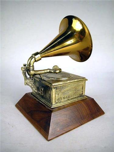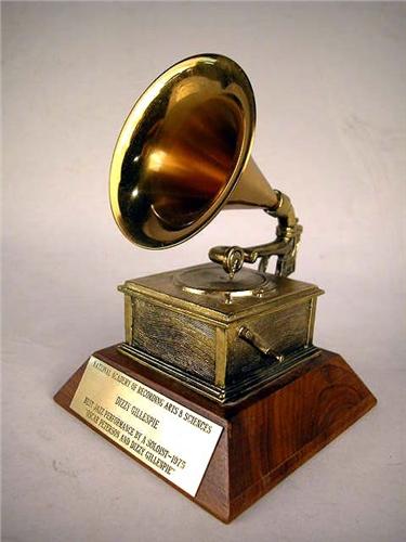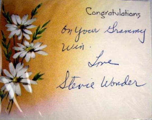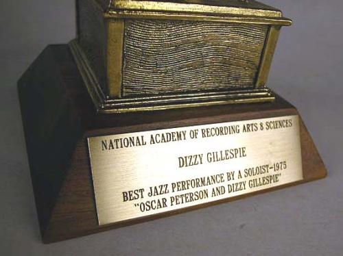 A NATIONAL ACADEMY OF RECORDING ARTS AND SCIENCES GRAMMY AWARD Inscribed to "Dizzy Gillespie Best Jazz Performance by a Soloist 1975 Oscar Peterson and Dizzy Gillespie", together with a small congratulations card "On your Grammy win love Stevie Wonder", 2 pieces