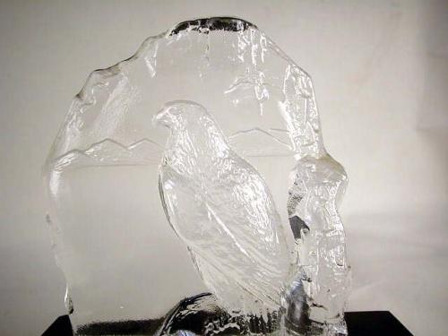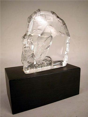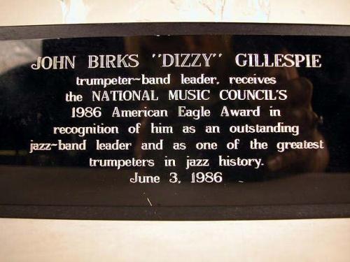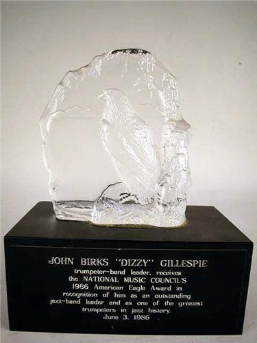 A NATIONAL MUSIC COUNCIL AMERICAN EAGLE AWARD The molded glass eagle on a base with plaque inscribed "John Birks 'Dizzy' Gillespie Trumpeter-Band Leader, Receives the National Music Council's 1986 American Eagle Award in Recognition of Him as an Outstanding Jazz-Band Leader and as One of the Greatest Trumpters in Jazz History, June 3, 1986", glass separated from base, 8 1/2"h x 7"w x 3 3/4"d