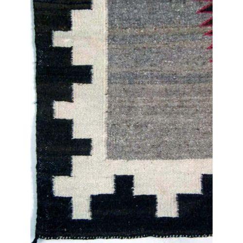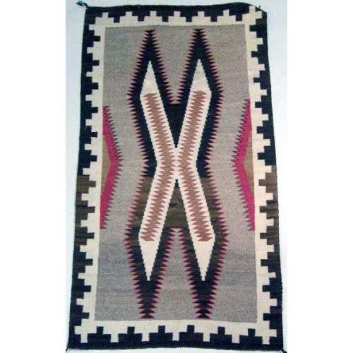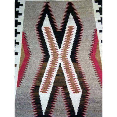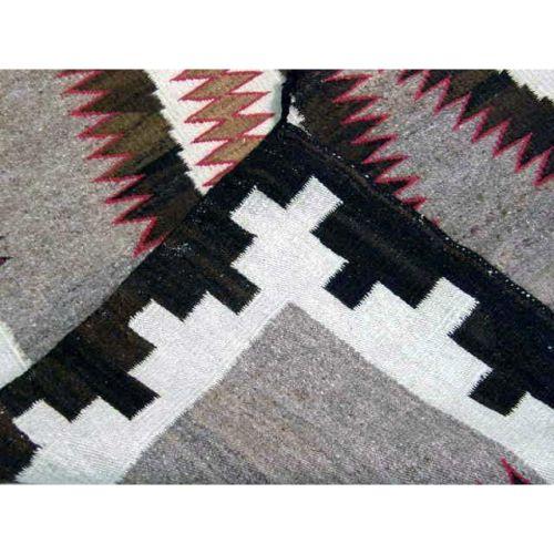 A NATIVE AMERICAN EARTHTONE WOVEN RUG<BR><BR>In shades of brown, beige, and red, with a brown and beige geometric border and central diamond design, wear, 75"l x 42"w
