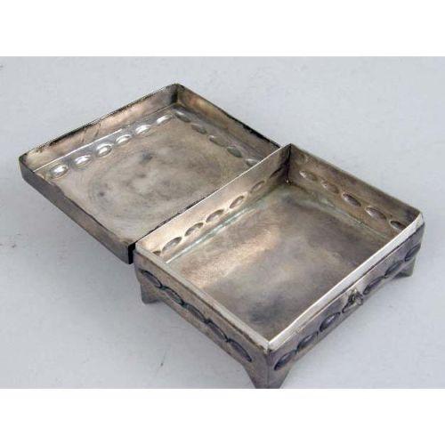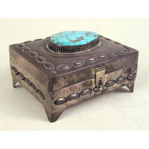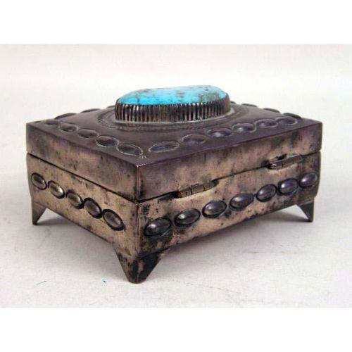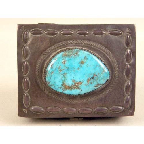 A NATIVE AMERICAN HINGED SILVER BOX<BR><BR>Set with large cabochon turquoise