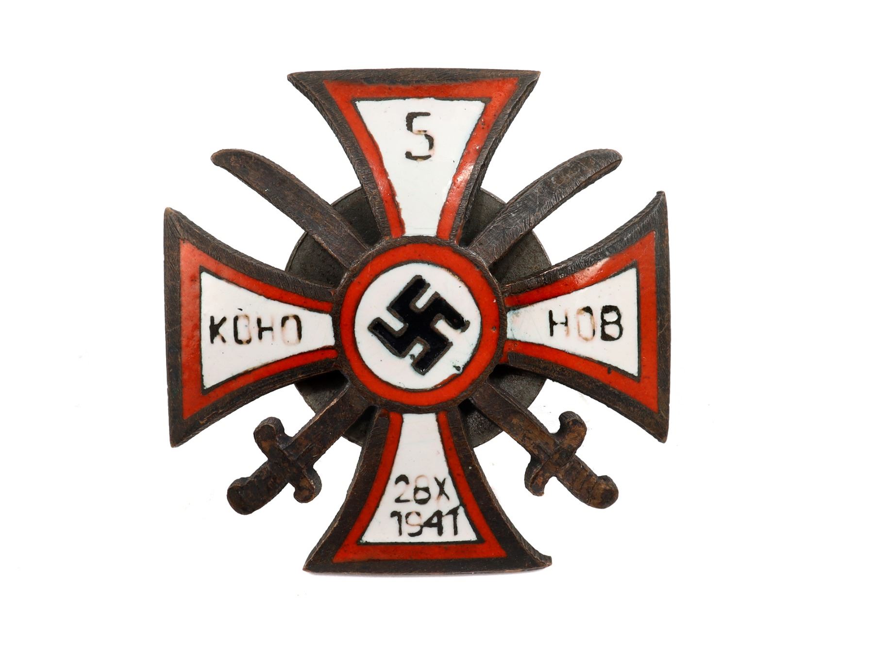 A Nazi German WW2 breast badge of the 5th Don Cossack Regiment. Die struck in bronze with an enamel finish. The obverse bears the regimental designation and date it was founded together with the commander surname Kononov in Cyrillic. Complete with a screwback fitting to the reverse and marked "WOLFSCHANZE". The 5th Don Cossack Cavalry Regiment was the first completely Russian unit, with its own officers, to fight for the Germans.