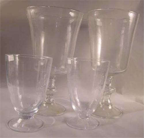 A NEAR PAIR OF COLORLESS GLASS CHALICES; On baluster form standards, Together with a pair of colorless glass footed vases 21"h x 11"diameter