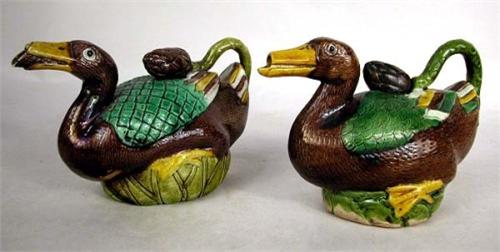 A NEAR PAIR OF ORIENTAL STYLE DUCK-FORM TEAPOTS; 4 1/2"h, losses