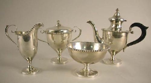 A NEOCLASSICAL DIMINUTIVE STERLING SILVER FOUR-PIECE BEADED BORDER TEA SERVICE COMPRISING; teapot with wooden handle, 7 1/2"h, a covered double-handled sugar, 6"h, a waste bowl and creamer, losses, apx. 35 T.O.
