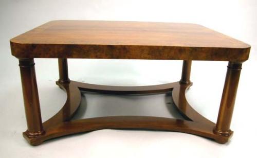 A NEOCLASSICAL STYLE INLAID MAHOGANY COFFEE TABLE; Baker Furniture Company, the rectangular top with rounded corners supported by Doric columns and ending in flattened ball feet 18"h x 38"w x 30"d
