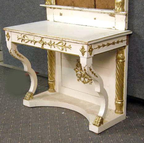 Table 28"h x 35"w x 21"d, frame 83"h x 38"w x 4"d Table with shrinkage cracks to top and base, and with paint nicked and chipped throughout. Frame lacking mirror, shrinkage cracks, cracks and losses to paint, repairs.