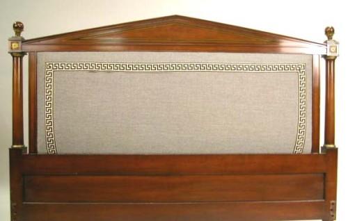 A NEOCLASSICAL STYLE ORMOLU-MOUNTED MAHOGANY BEDSTEAD; With pitched-pediment headboard flanked by columnar supports, Together with a matching upholstered club chair, curtains, and bedstead 5'6"w