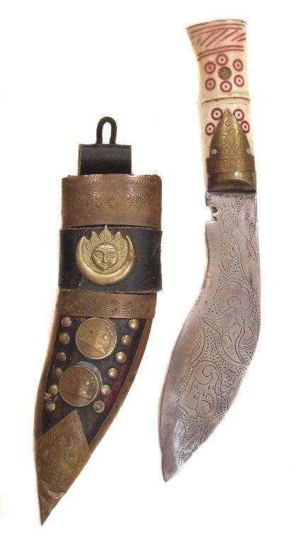 With bone grip and characteristic blade. In its embellished scabbard. 20th century. Overall length 28.5 cm.