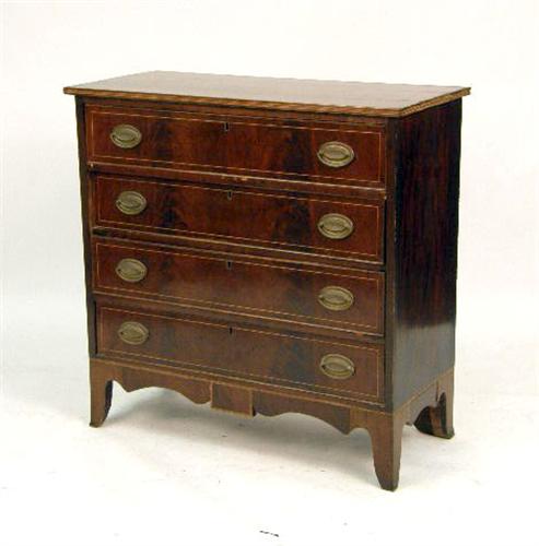Four long drawers above a shaped inlaid skirt. 37"h x 37 1/2"w x 17"d Veneer loss.