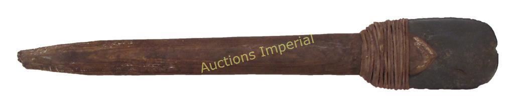 The stone head lashed to the wooden haft with rawhide. First half of the 20th century. Overall length 34.2 cm.
