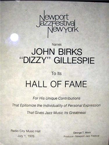 A NEWPORT JAZZ FESTIVAL NEW YORK CERTIFICATE Under plexiglas and affixed to wood plaque, naming John Birks "Dizzy" Gillespie to its Hall of Fame, awarded at Radio City Music Hall, July 1, 1976, 15"h x 12"w