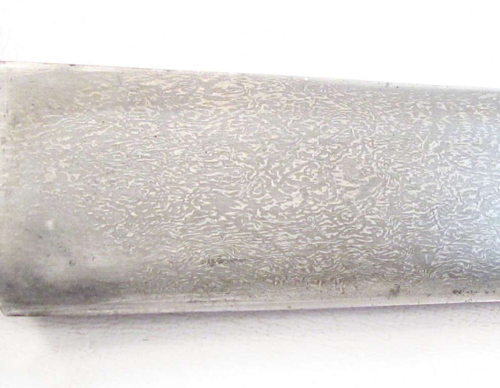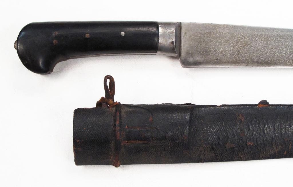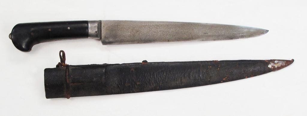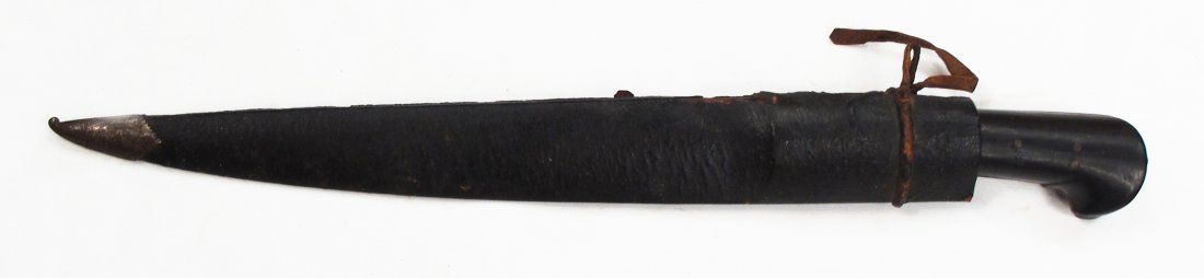 A robust example of the type, with polished horn grips and steel bolsters, the single-edged blade forged of finely patterned silver-gray wootzdamascus steel. In its leather-covered wooden scabbard.Mid-19th century.Overall length 39.3 cm. Condition I