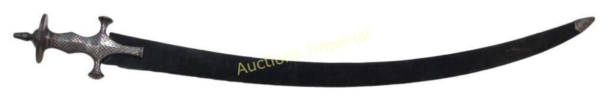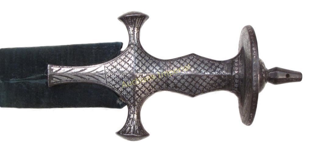 Characteristic of Udaipur work, the well-wrought iron hilt elaborately inlaid overall in geometrical flowering vine motifs in silver. The long, curved, single-edged blade retaining much original finish. In its velvet-covered wooden scabbard with silver chape. Early 19th century. Light wear. Overall length 90 cm.