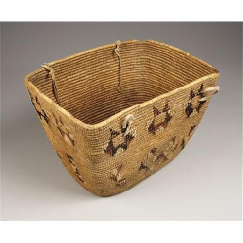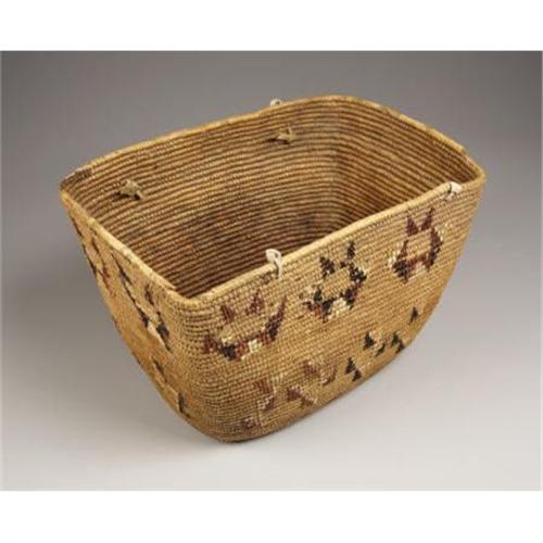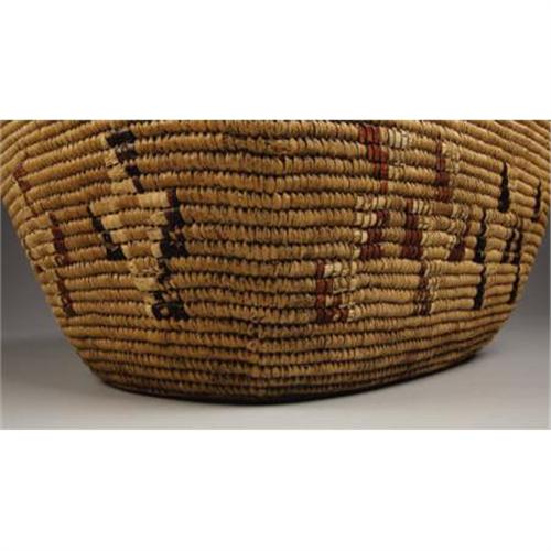 <B>A NORTHWEST COAST UTILITY BASKET<BR><BR></B></I>c. 1900<B><BR><BR></B></I> with inbricated design<BR><BR>Length: 14 3/4 inches <B>Condition Report:</B> Overall poor with heavy soiling. Rim with approx. 23 areas of loss. longest approx. 5" . Fiber loss on bottom. No apparent restoration.<BR><BR><b>Shipping:</b> Requires 3rd Party Shipping (<a target="_blank" href="http://www.heritageauctions.com/common/shipping.php">view shipping information</a>)