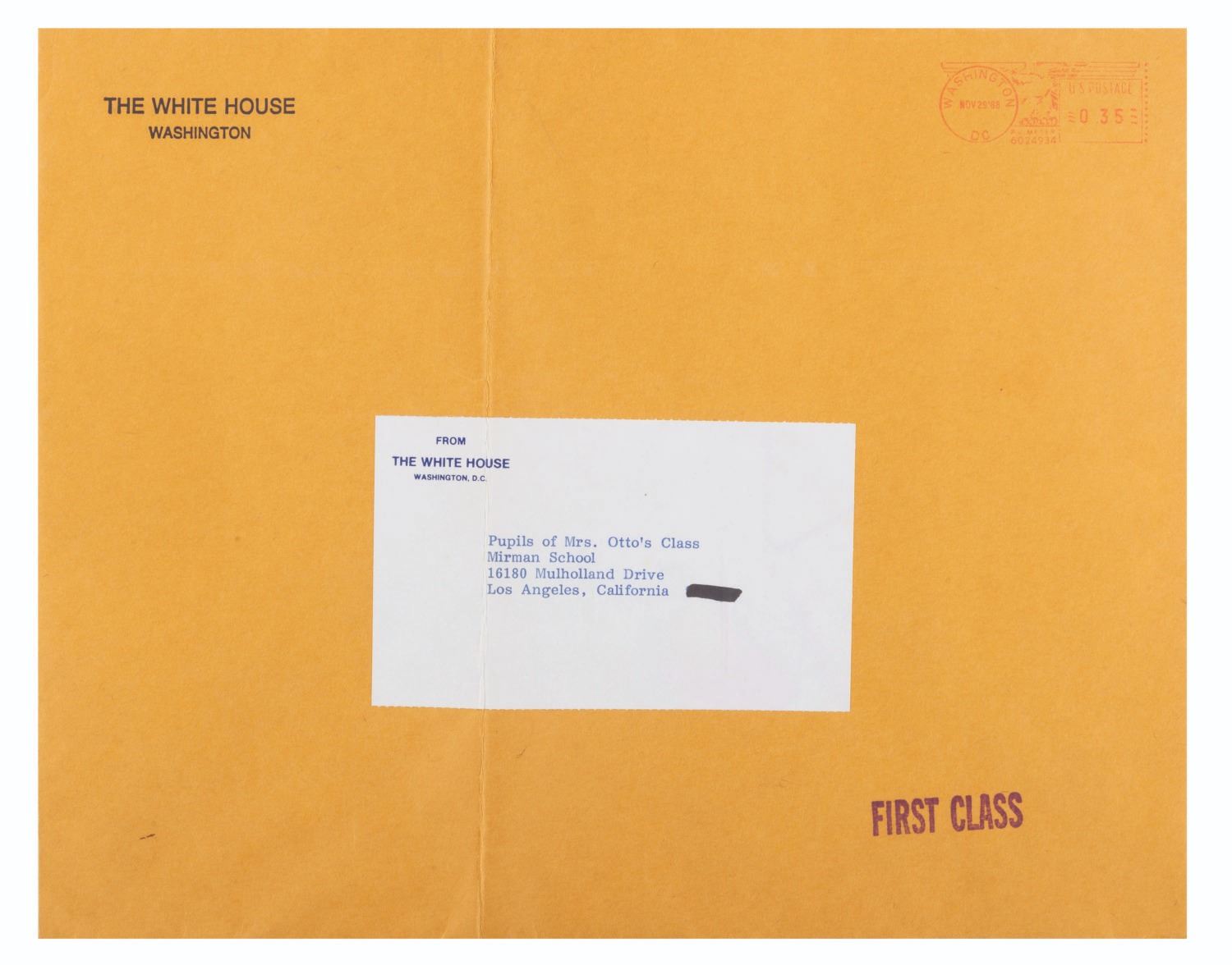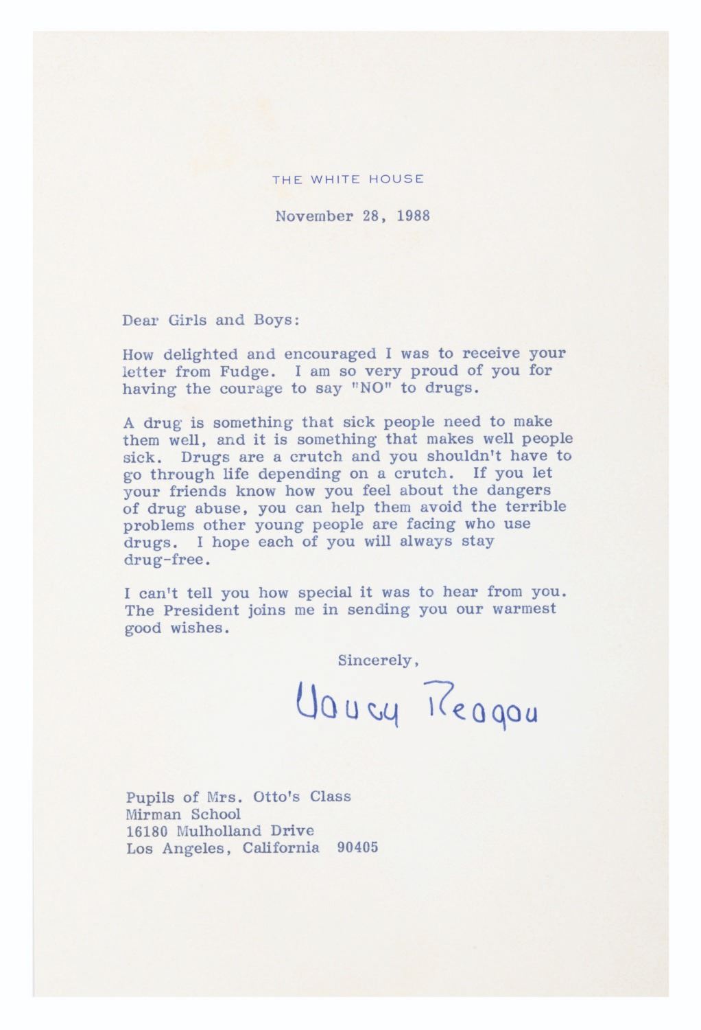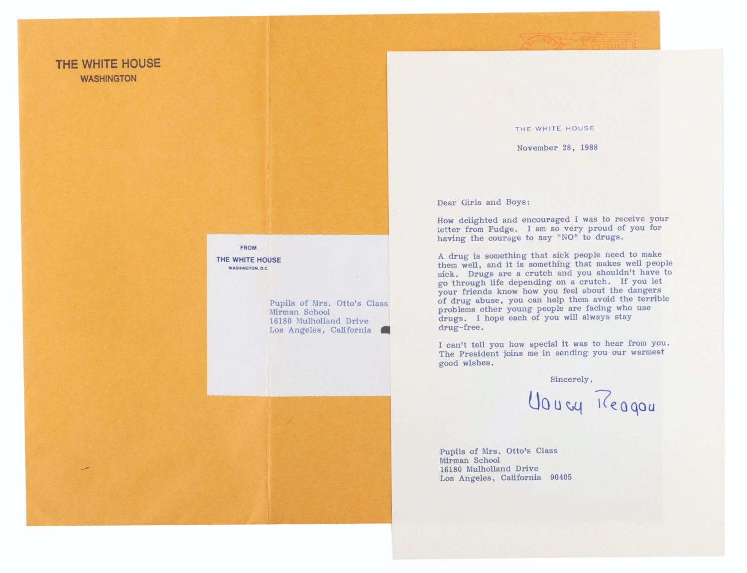 (The White House, 1988) A signed letter from First Lady Nancy Reagan to the pupils of Mrs. Otto’s class at the Mirman School Los Angeles. In the letter, Reagan thanks the children for saying no to drugs, explains how drugs are bad, and encourages them to keep others off drugs. Reagan signed the letter in blue marker. Measuring 6.25” x 9.5” with its original 9.5” x 12” mailing envelope from The White House, the letter displays in very good condition with spots of discoloration, marks on the envelope from mailing, and a full vertical fold on the envelope.