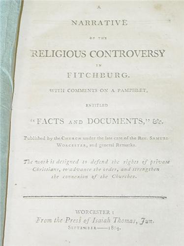 A Narrative of the Religious Controversy in Fitchburg. With Comments on a Phamphlet, Entitiled "Facts and Documents," &c. Published By the Church Under the Late Care of the Rev. Samuel Worcester. Worcester: From the Press of Isaiah Thomas, Jun., 1804. 8vo - over 7¾" - 9¾" tall. Soft Cover. Fair condition. THIS IS NOT AN EX-LIBRARY BOOK. 71pp [1] 4 Notes, in a soft paper cover, single thread stitched. Pages are age darkened, with occasional foxing.