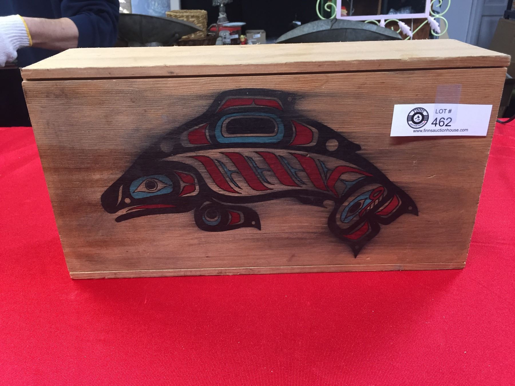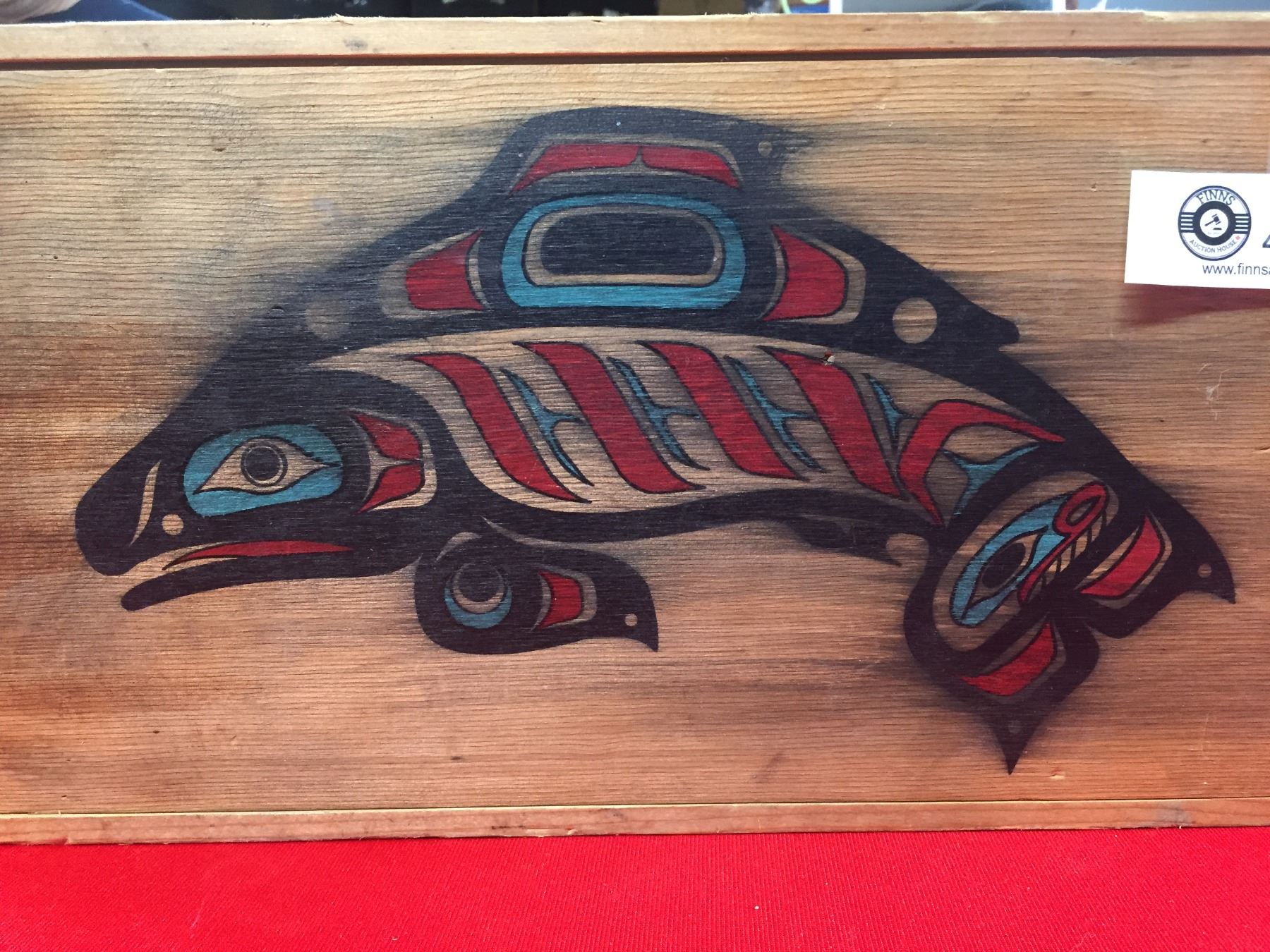 A Native Salmon Picture on a Wooden Box. New. 16" w x 8" h x 4.5" Thick
