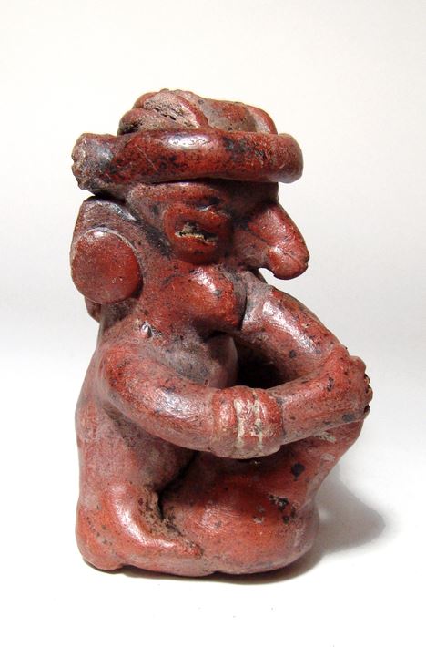 A Nayarit sitting pulque drinker, West Mexico, c. 200 BC - AD 200, wearing elaborate headdress, ear spools and bracelets, his cheeks expanded as he drinks, the vessel supported by both of his hands. H: 4 1/2 in. Beautiful brick red surfaces with mottled mineral deposits. Ex Dr. John Hilsabeck estate, Orange County.