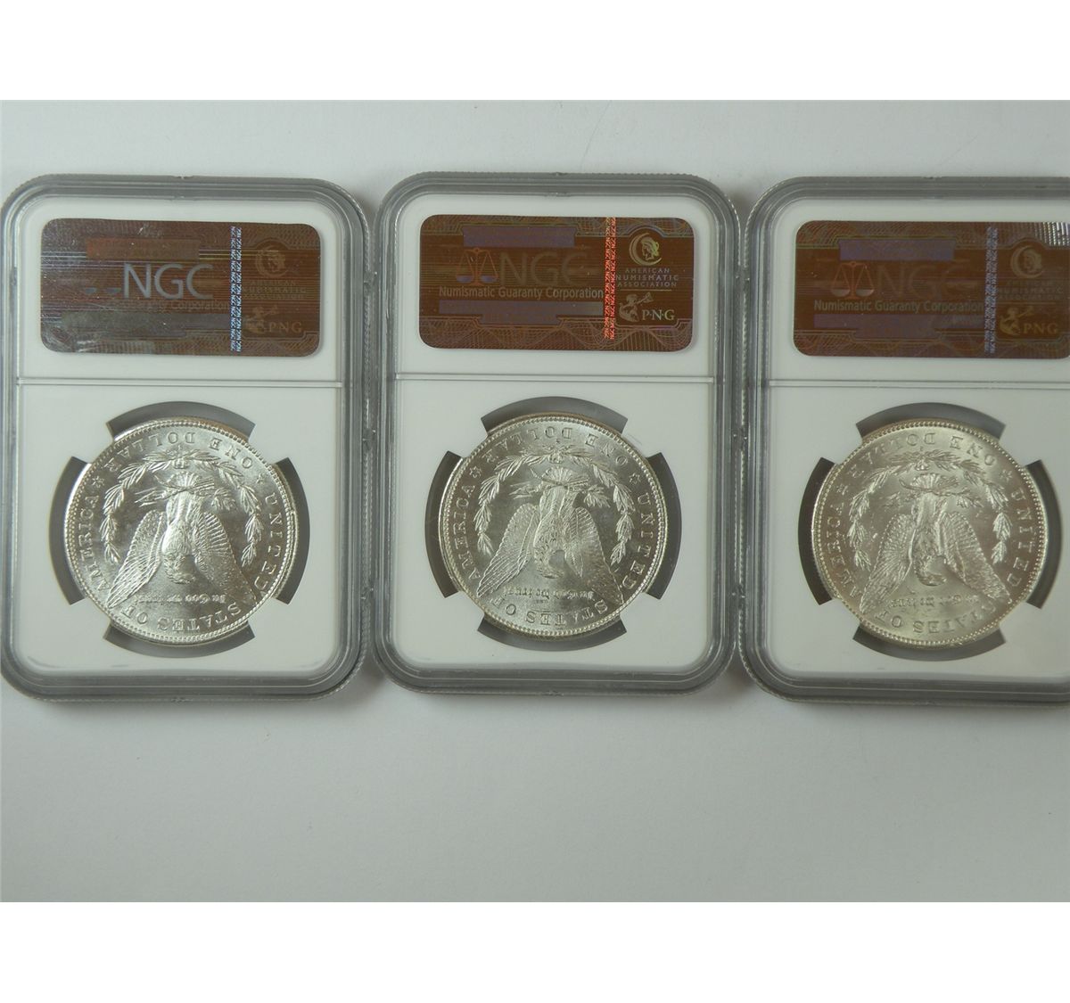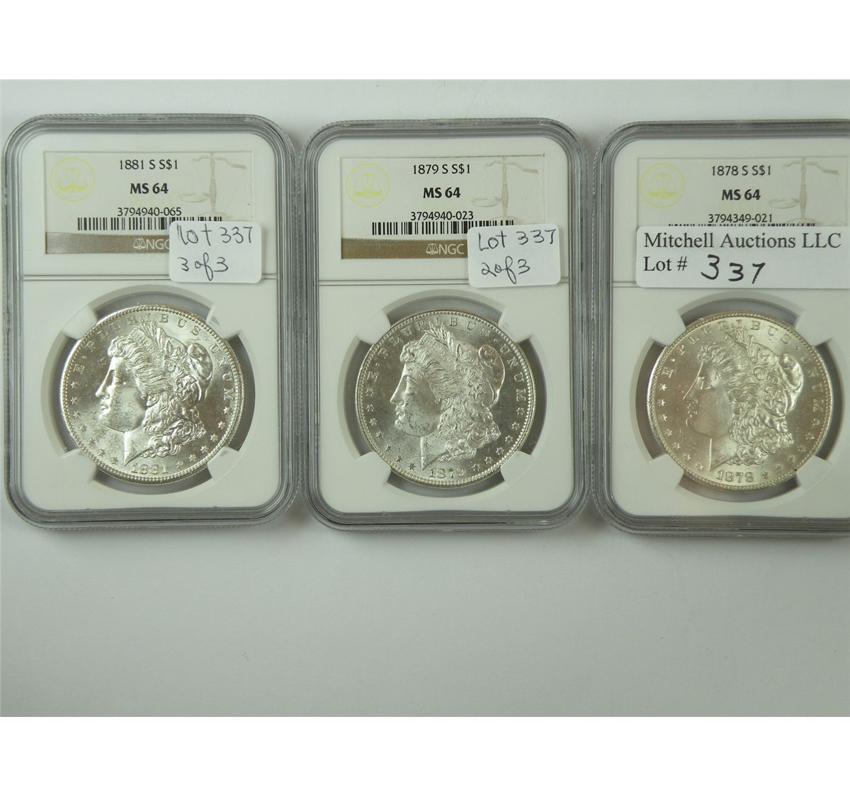 A Near Gem San Francisco Mint Trio of Morgan Dollars: 1878-S, 1879-S, 1881-S. All NGC MS64, and all are sharp, satiny, and attractive. A total of 3 coins. Est. $210