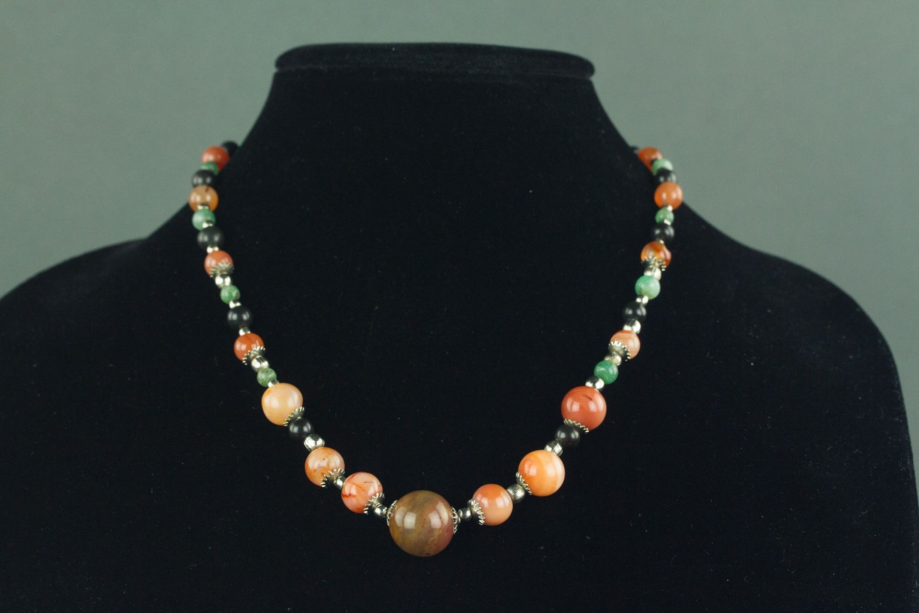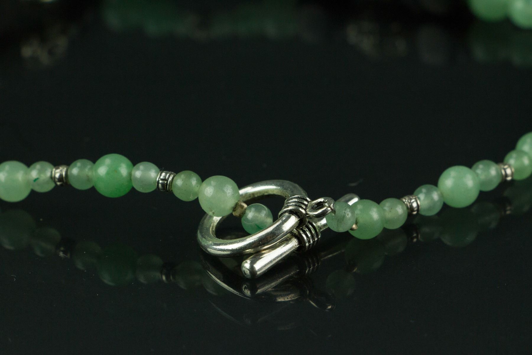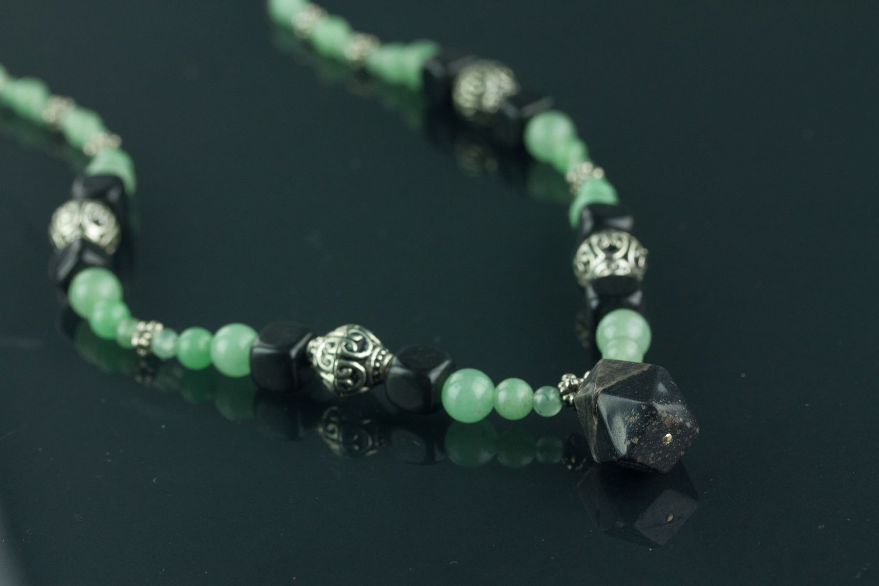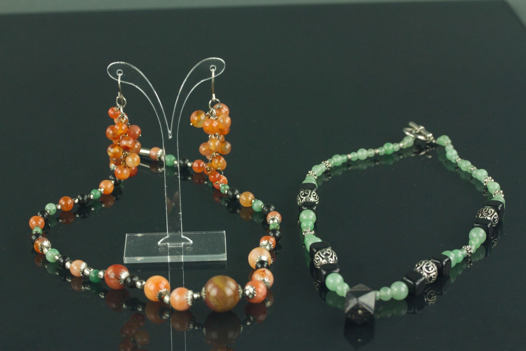 Chinese Necklace with silvered beads; comprised of round-cut green hardstone and facet-cut onyx; L: 47 cm, D:17 cm, Earrings L: 5 cm, 111 grams total; Necklace with assorted beads; L: 50 cm, 39 grams.