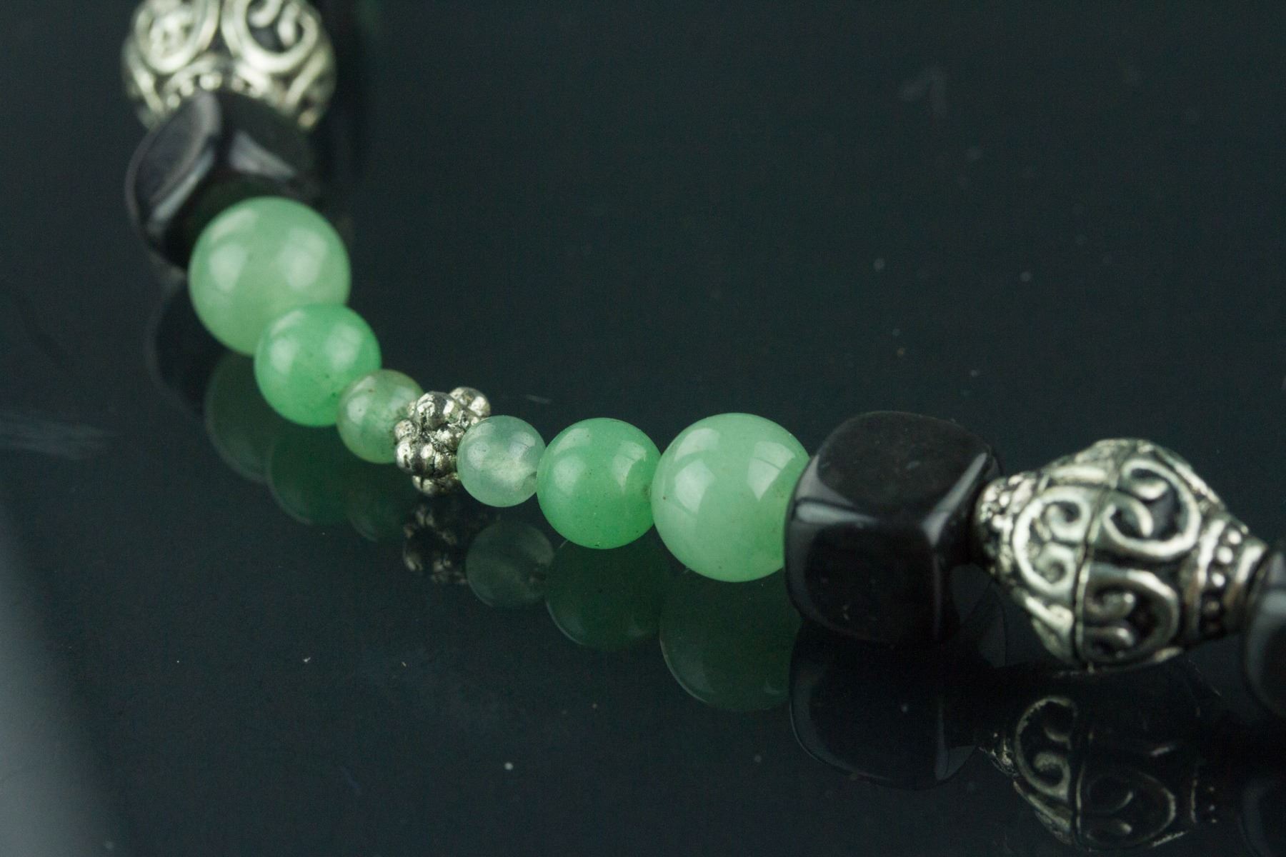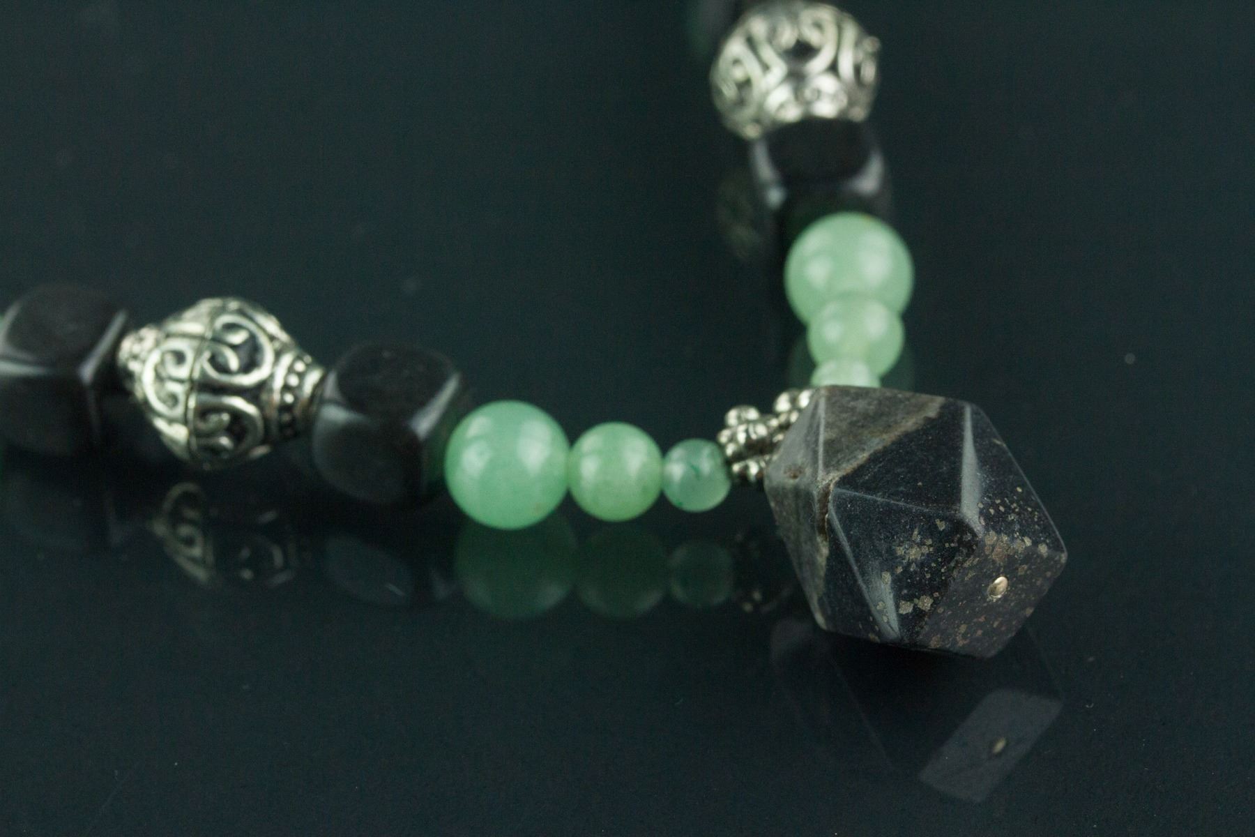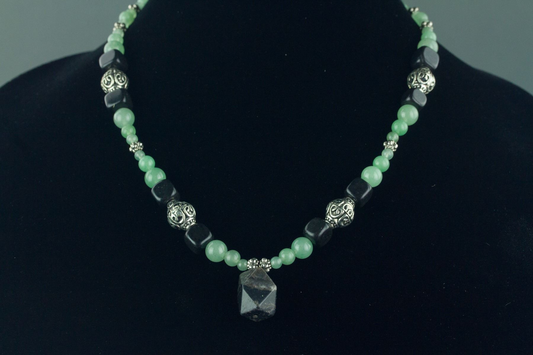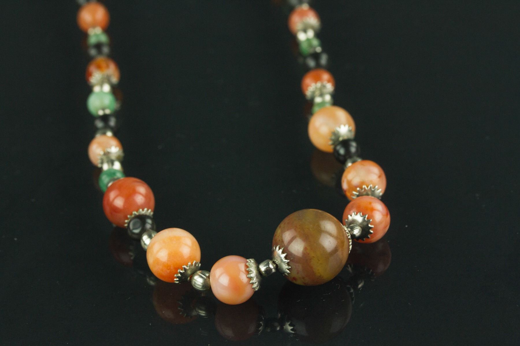 Chinese Necklace with silvered beads; comprised of round-cut green hardstone and facet-cut onyx; L: 47 cm, D:17 cm, Earrings L: 5 cm, 111 grams total; Necklace with assorted beads; L: 50 cm, 39 grams.