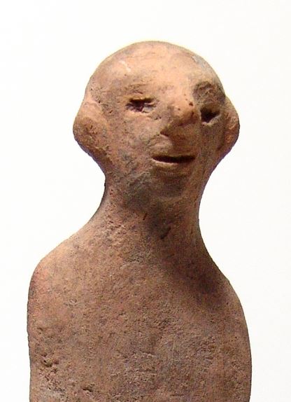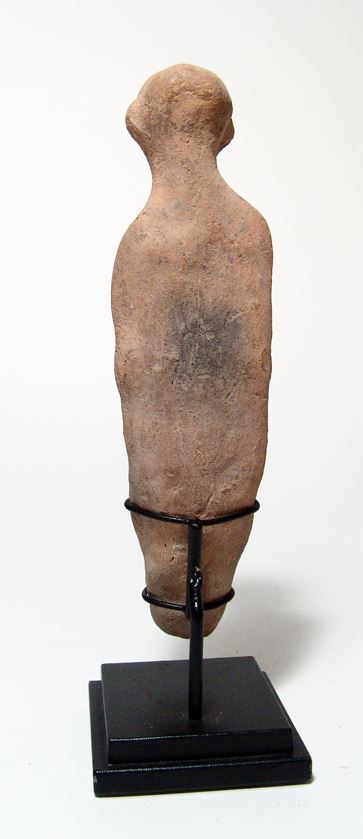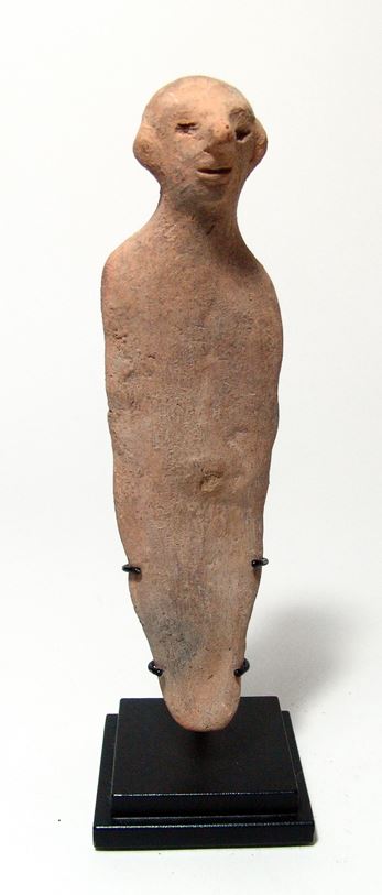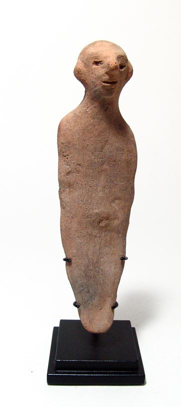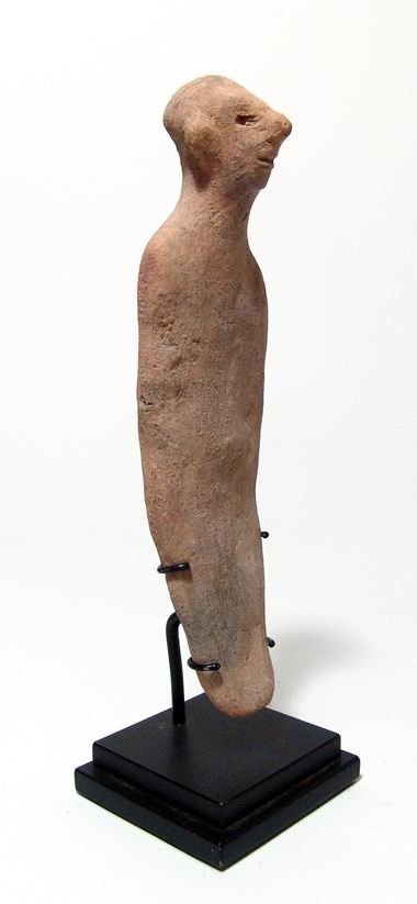 A Neolithic ceramic idol, Holy Land, c. 8th - 7th Millennium BC, with human head and tall, featureless body, feet slightly curved outward. I most interesting piece, the head well-formed with large nose, narrow eyes, jutting ears and open mouth. H: 5 ¾ in (14.6 cm). Mineral deposits throughout, custom base. Ex Archaeology Center, Tel-Aviv.