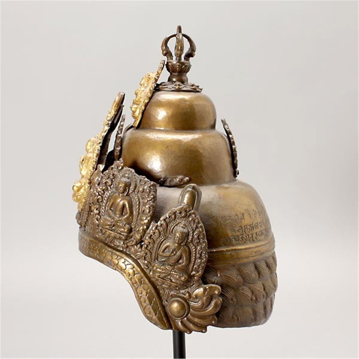 A Nepalese Parcel-Gilt Copper Ritual Helmet, Of tiered dome form, the top of the helmet surmounted by a half-vajra finial, the reverse incised with three lines of inscription, with separately applied headband repousse in relief with five leafy palmette form ornaments inhabited by the five Tathagata Buddhas. 19th Century, Height: 10 3/4 inches (27.3 cm) Provenance:Acquired from Sotheby's New York, Sale 6506, December 1, 1993.