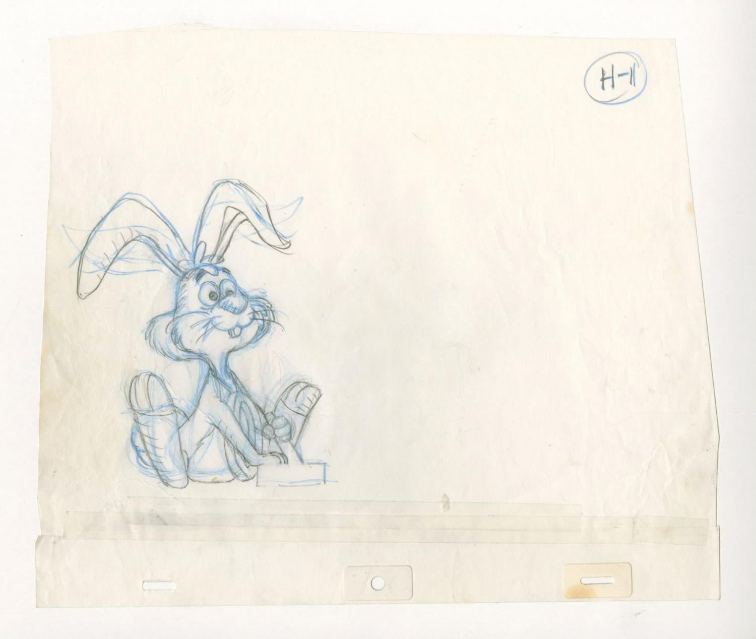 (Nestle, 1980s-90s) An original production drawing of the Nesquik bunny from a Nestle commercial. The character has an image size of 5.5” x 4.25” on 10.5” x 12.5” animation paper. The graphite and colored pencil drawing is in good condition with discoloration, wrinkling, top edge wear and the paper is trimmed unevenly and attached with tape to new peg holes.