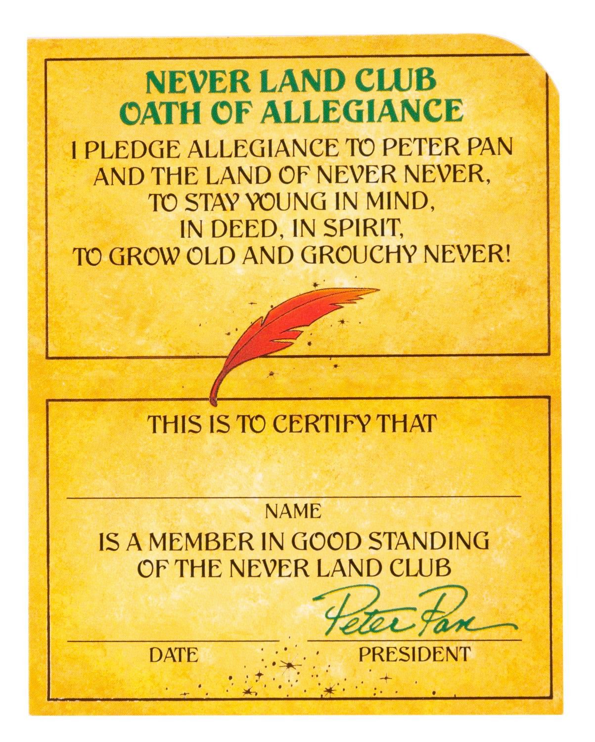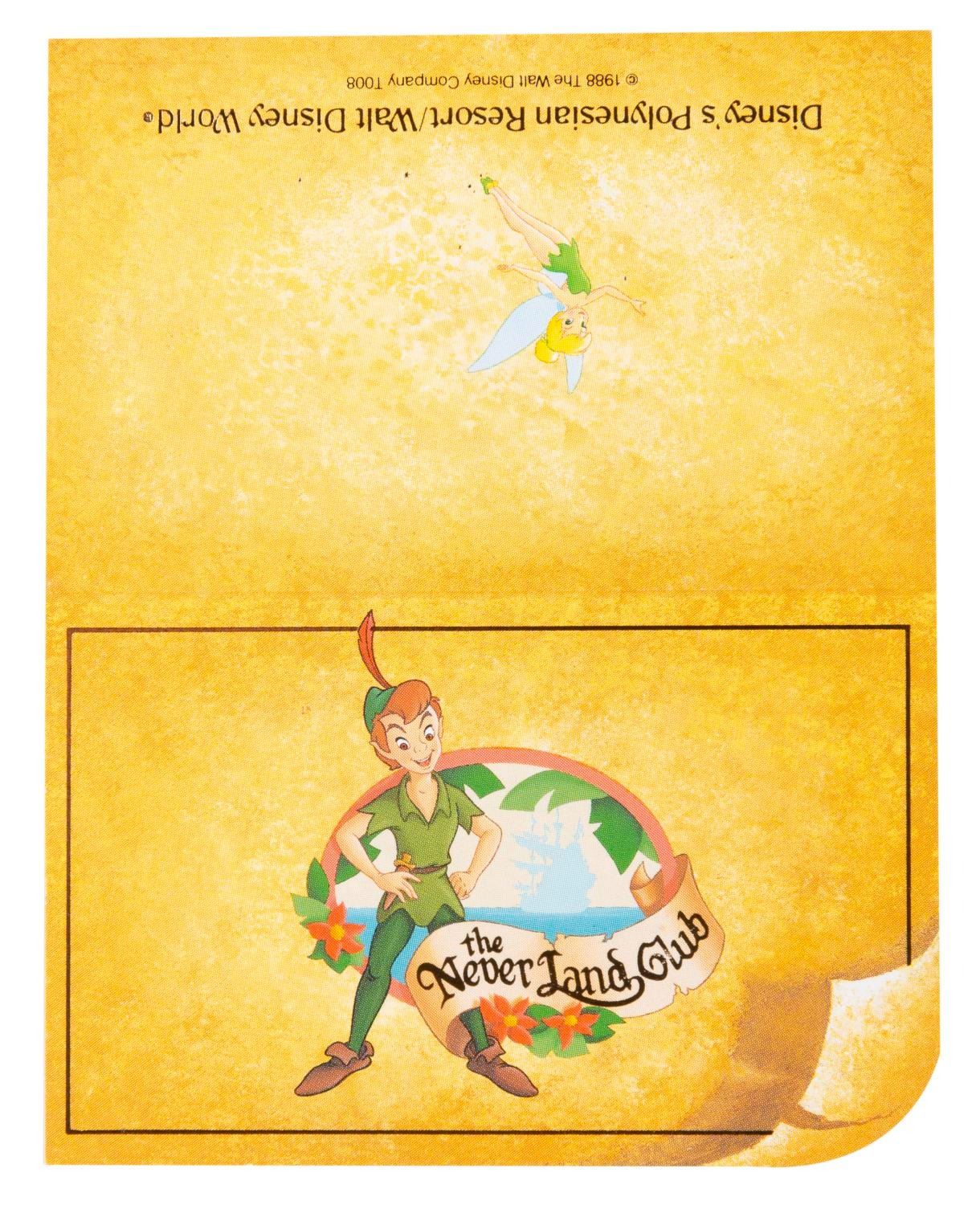 (Disney's Polynesian Village Resort, 1988) A Peter Pan oath of allegiance card and decal, given to children at The Neverland Club in Disney's Polynesian Village Resort. The unused card measures 3.75" x 4.25" and the decal 4.25" x 5.5", in very good to fine condition with light wear.