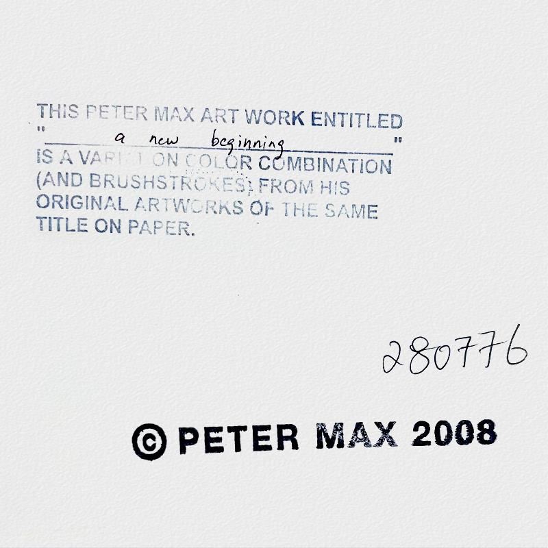 "A New Beginning" is a one-of-a-kind mixed media on paper, hand signed by Peter Max. The piece comes custom framed with a backside cutout to display Peter Max Studio registration number 280776 certifying authenticity. Measures approximately 35" x 29" (frame), 24" x 18" (image). This item requires special handling and may have a longer than usual turnaround.