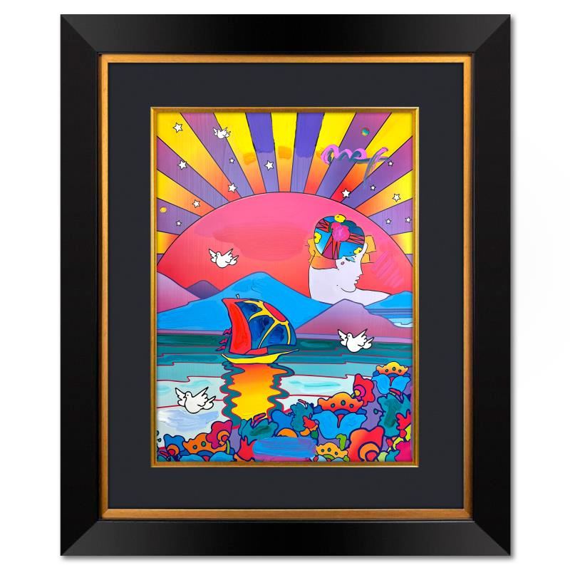 "A New Beginning" is a one-of-a-kind mixed media on paper, hand signed by Peter Max. The piece comes custom framed with a backside cutout to display Peter Max Studio registration number 293912 certifying authenticity. Measures approximately 35" x 29" (frame), 24" x 18" (image). This item requires special handling and may have a longer than usual turnaround.