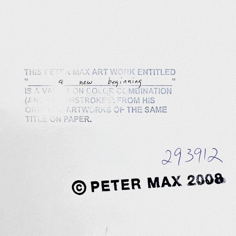 "A New Beginning" is a one-of-a-kind mixed media on paper, hand signed by Peter Max. The piece comes custom framed with a backside cutout to display Peter Max Studio registration number 293912 certifying authenticity. Measures approximately 35" x 29" (frame), 24" x 18" (image). This item requires special handling and may have a longer than usual turnaround.