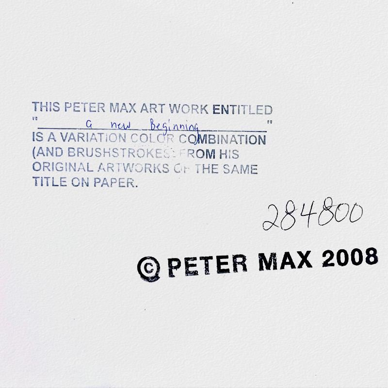 "A New Beginning" is a one-of-a-kind mixed media on paper, hand signed by Peter Max. The piece comes custom framed with a backside cutout to display Peter Max Studio registration number 284800 certifying authenticity. Measures approximately 35" x 29" (frame), 24" x 18" (image). This item requires special handling and may have a longer than usual turnaround.