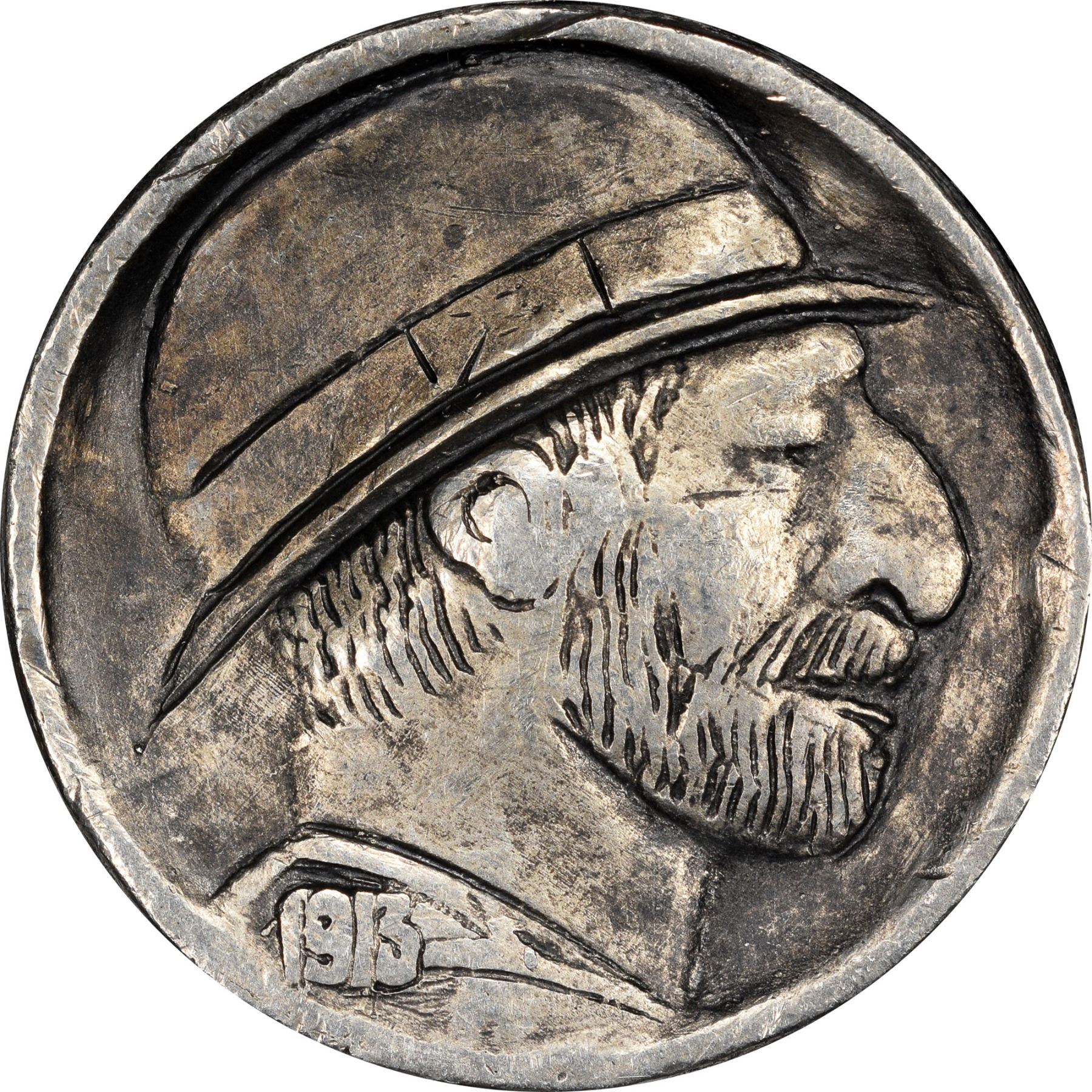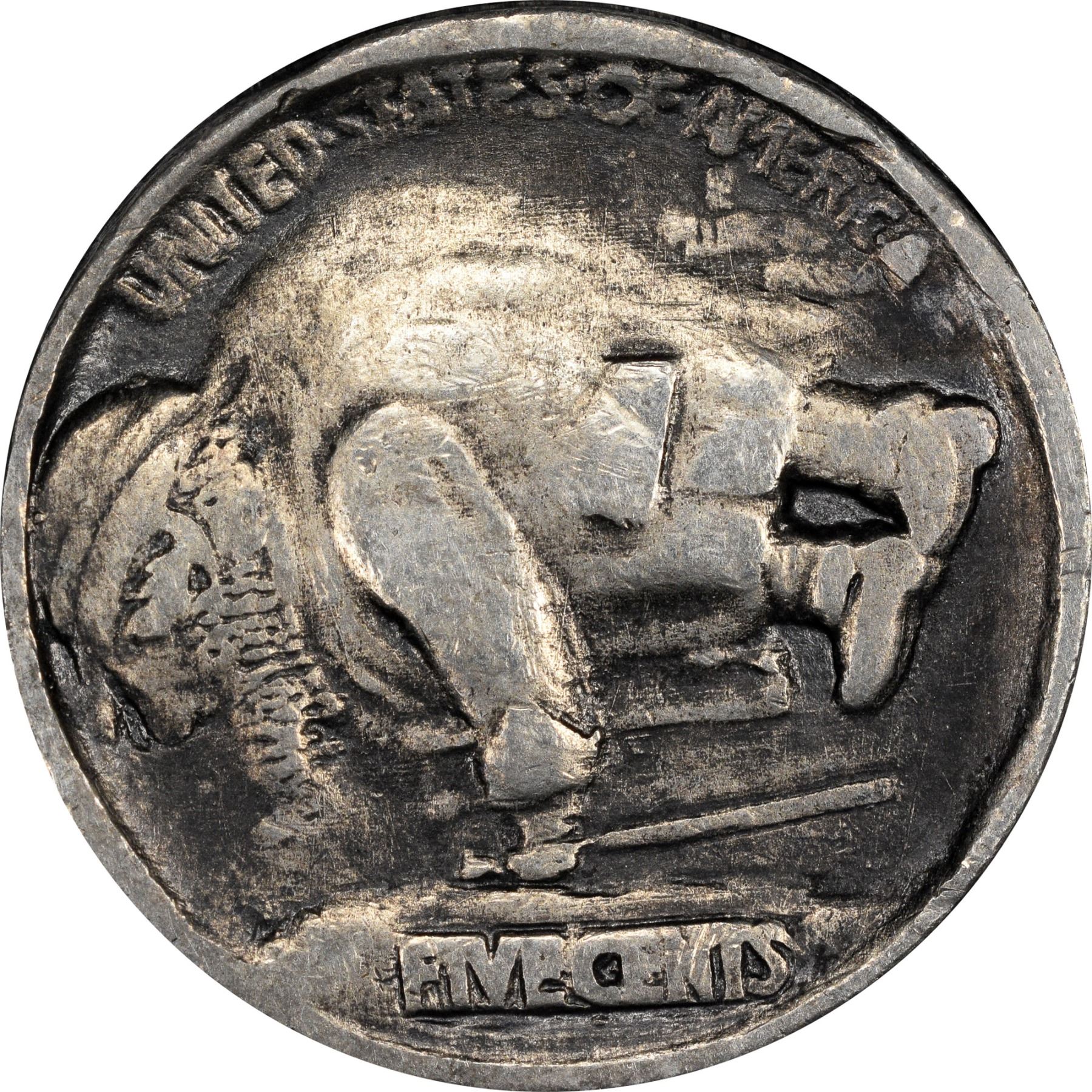 Description: This lot is comprised of two unusual nickels; a two-sided cast carving with the Buffalo morphed into a walking hobo and the obverse as the quintessential bearded and domed hat hobo. The additional nickel displays an example of a machine/dremel bearded carved hobo. (Total: 2 coins)