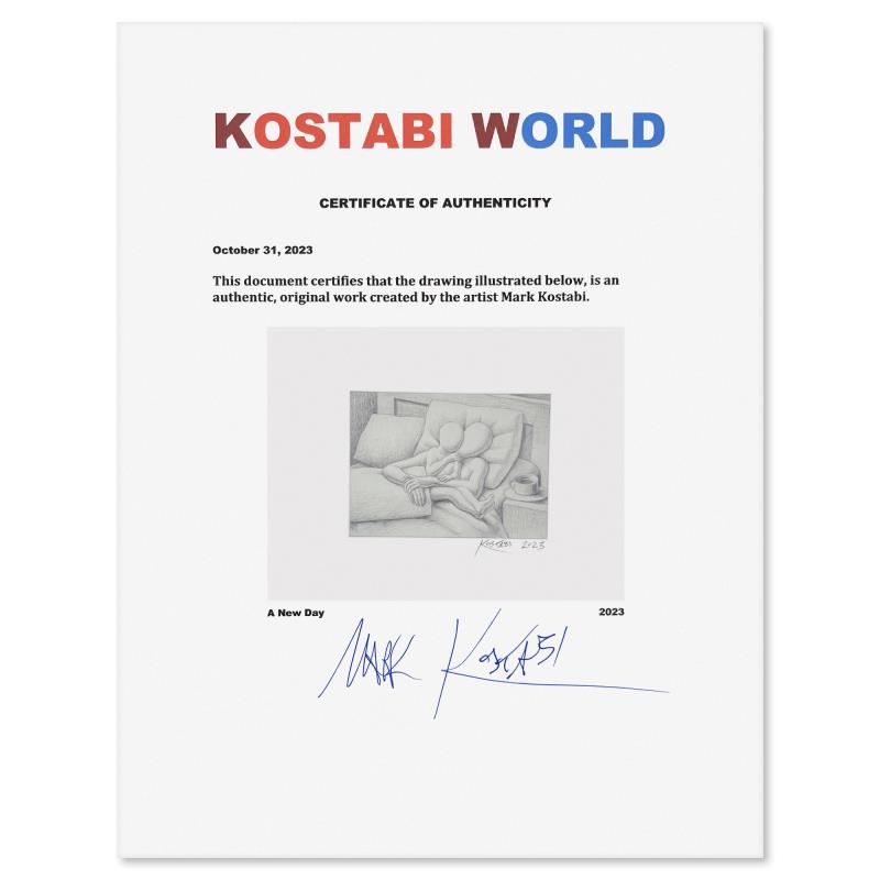 "A New Day" is an original drawing on paper by Mark Kostabi, hand signed by the artist. This piece comes custom framed and includes a certificate of authenticity. Measures approximately 12.5" x 14" (frame), 6.5" x 8" (image). This item requires special handling and may have a longer than usual turnaround.