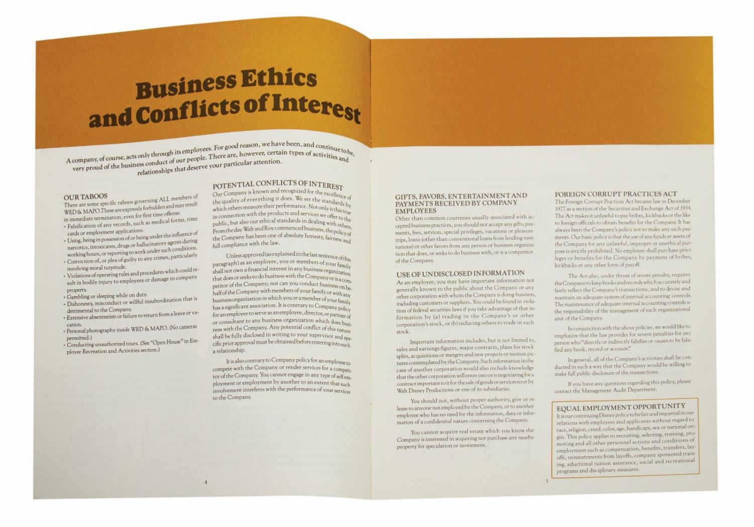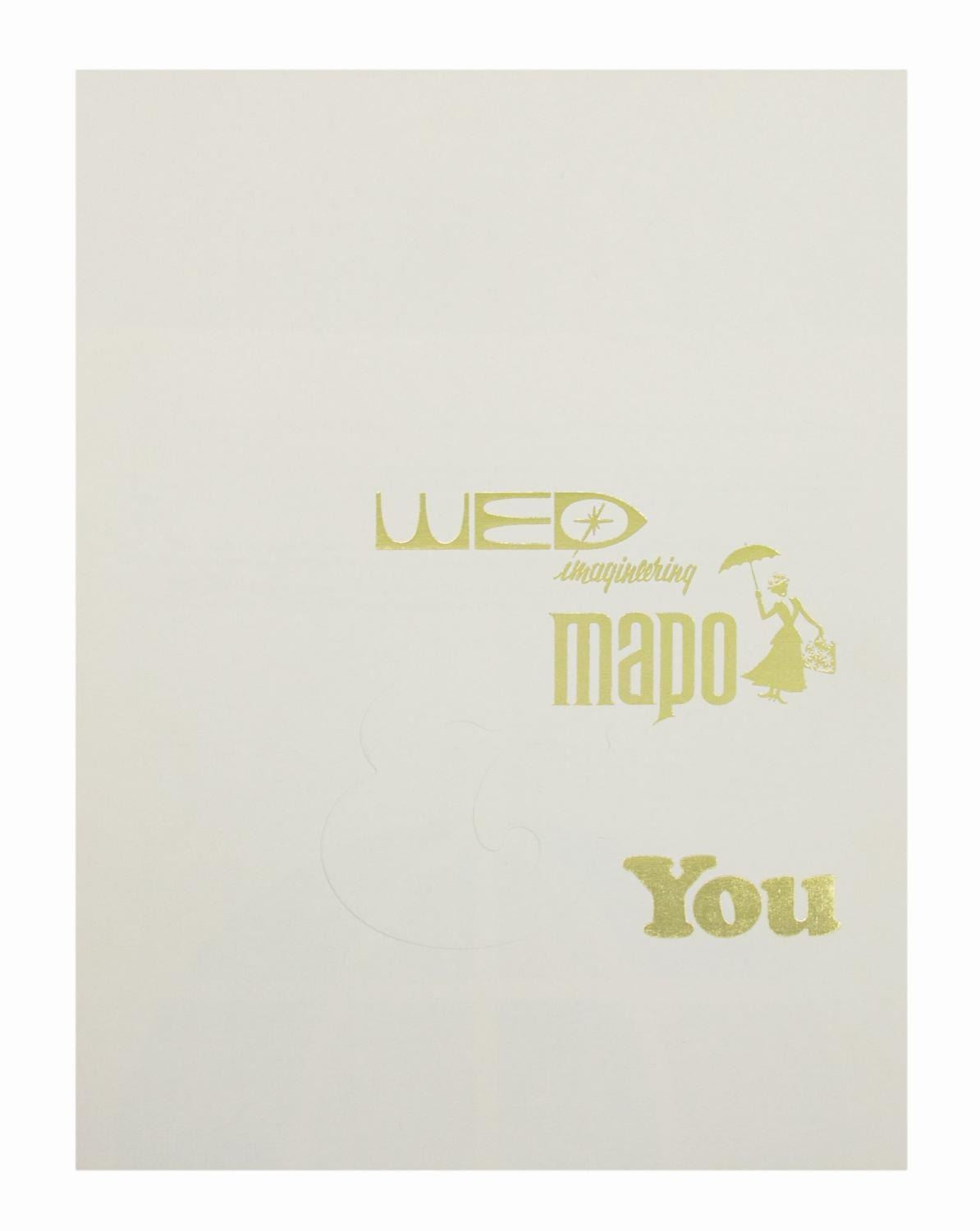 (WDI, 1970s-80s) An orientation booklet issued to new WED/MAPO employees titled WED/MAPO & You. The staple-bound 12-page guide introduces new hires to the Disney Way and addresses topics such as the first name basis policy, pay, promotions, benefits, and perks. Measuring 11” x 8.5”, the booklet is in fine condition with minor wear to the spine. Attached to the top of an interior page is an adhesive-backed note paper with an internal employee code, placed by a former WDI employee.