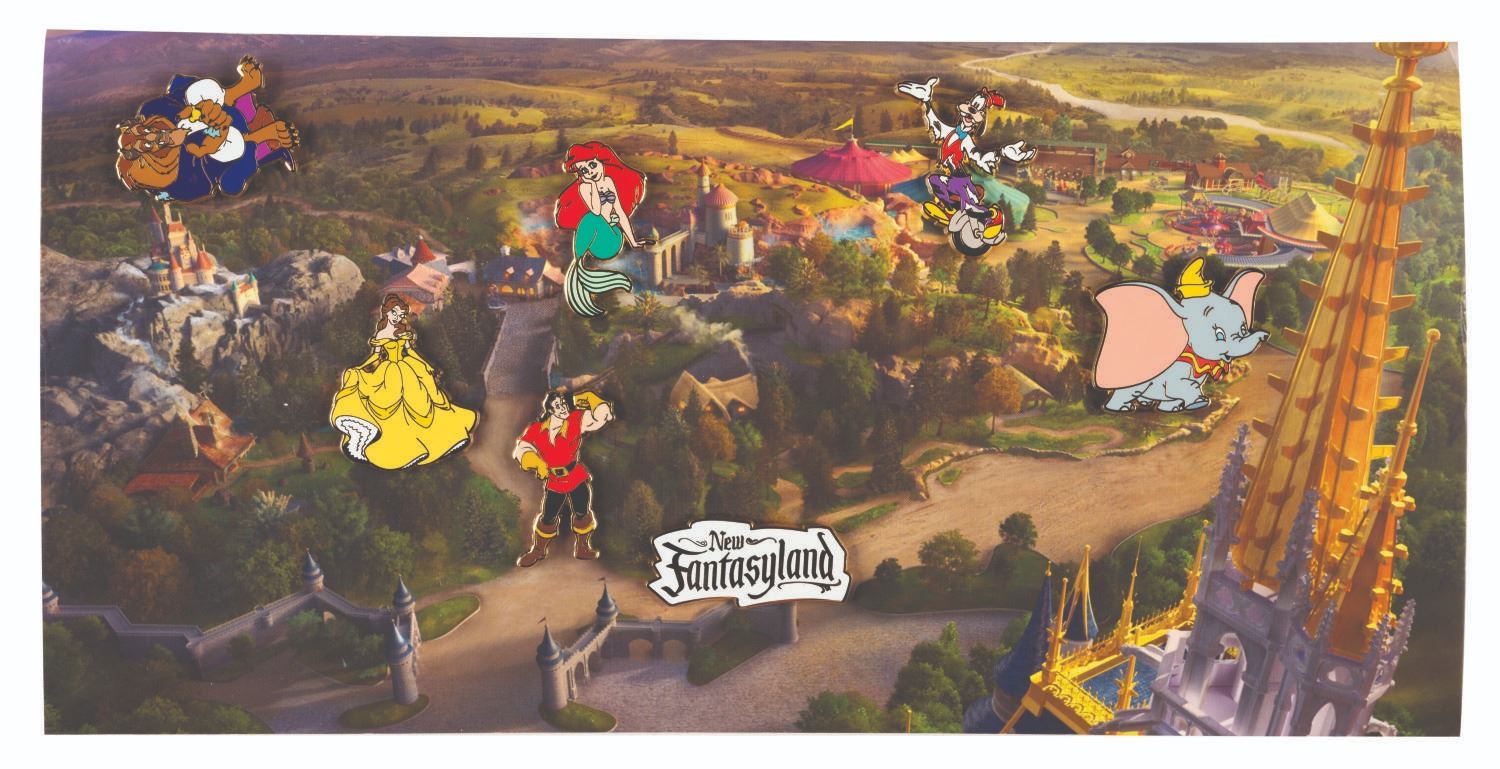 (Walt Disney World, 2012) A seven-pin set given to press members for the opening of the Magic Kingdom’s new Fantasyland. The pins include Belle, the Beast, Gaston, Ariel, Goofy, Dumbo, and the land’s logo. Ranging in size from 1” x 1.25” to 1” x 1.75”, the pins are in fine condition, while the 6” x 12” card is in very good condition with light wear.