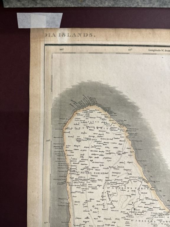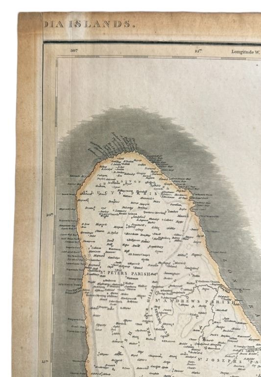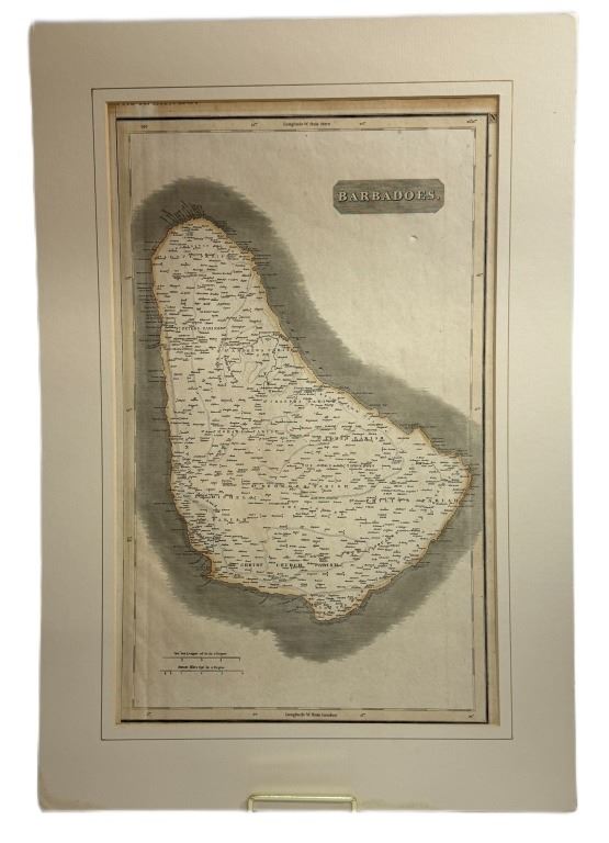 Item/Description: Antique map print of Barbados by cartographer John Thomson (1777–c.1840), published in "A New General Atlas" in 1817, and engraved by James Kirkwood & Son. Titled "BARBADOES," reflecting the island's historical colonial spelling used from the 1600s until around 1850. The map showcases detailed parishes, towns, forts, bays, and plantations, and highlights Barbados' significance as a British sugar-producing colony during this time. time of the 1816 slave rebellion. Framed in a later period frame.