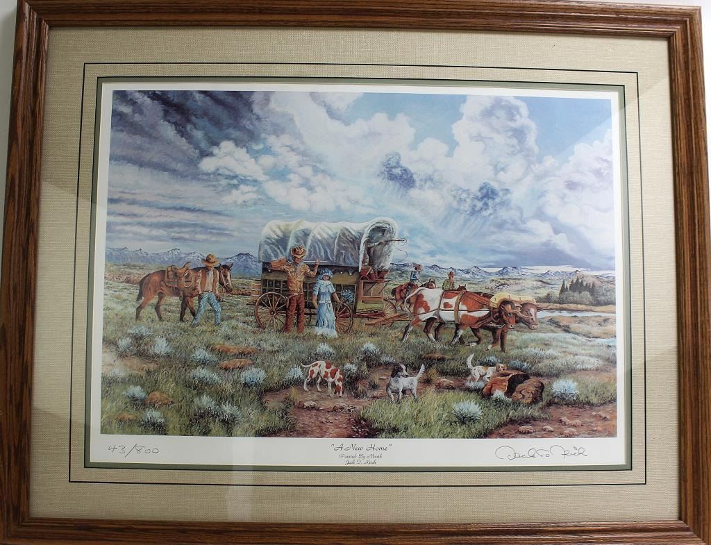 "A New Home" by Isabel SD artist Jack F. Reich, being confined to a wheelchair since birth, unable to use his arms and legs, Reich paints by mouth, pencil signed in lower right corner, # 43 /800, image 17" X 24".F. Reich, being confined to a wheelchair since birth, unable to use his arms and legs, Reich paints by mouth, pencil signed in lower right corner, # 43 /800, image 17" X 24".