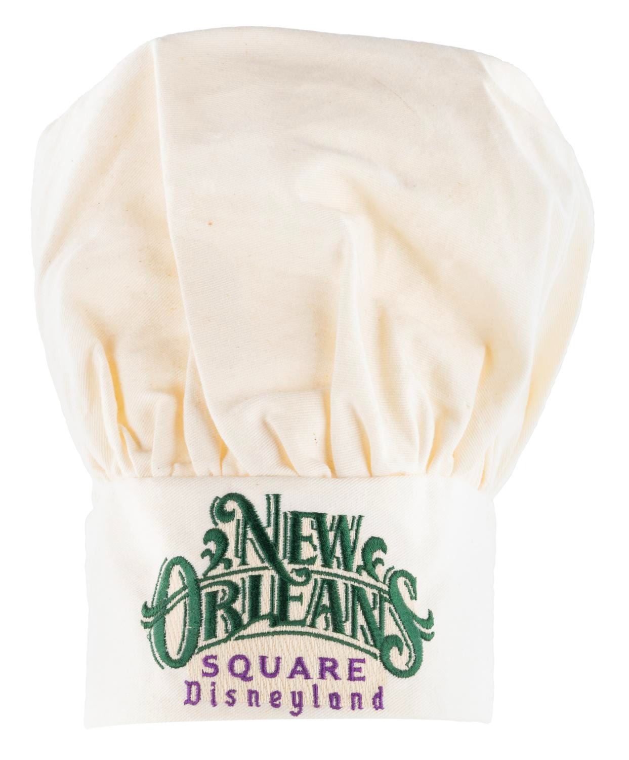 (Disneyland, 1990s-2000s) A New Orleans Square chef’s hat. Measuring 9” tall and featuring an adjustable velcro strap, the 100% cotton hat is in good condition with light stains, wear, and discoloration from age.