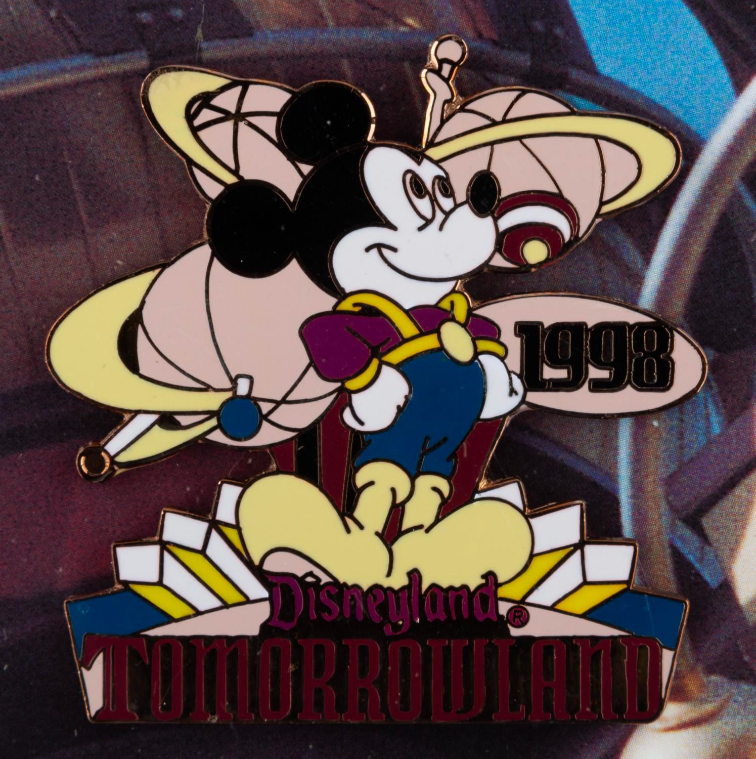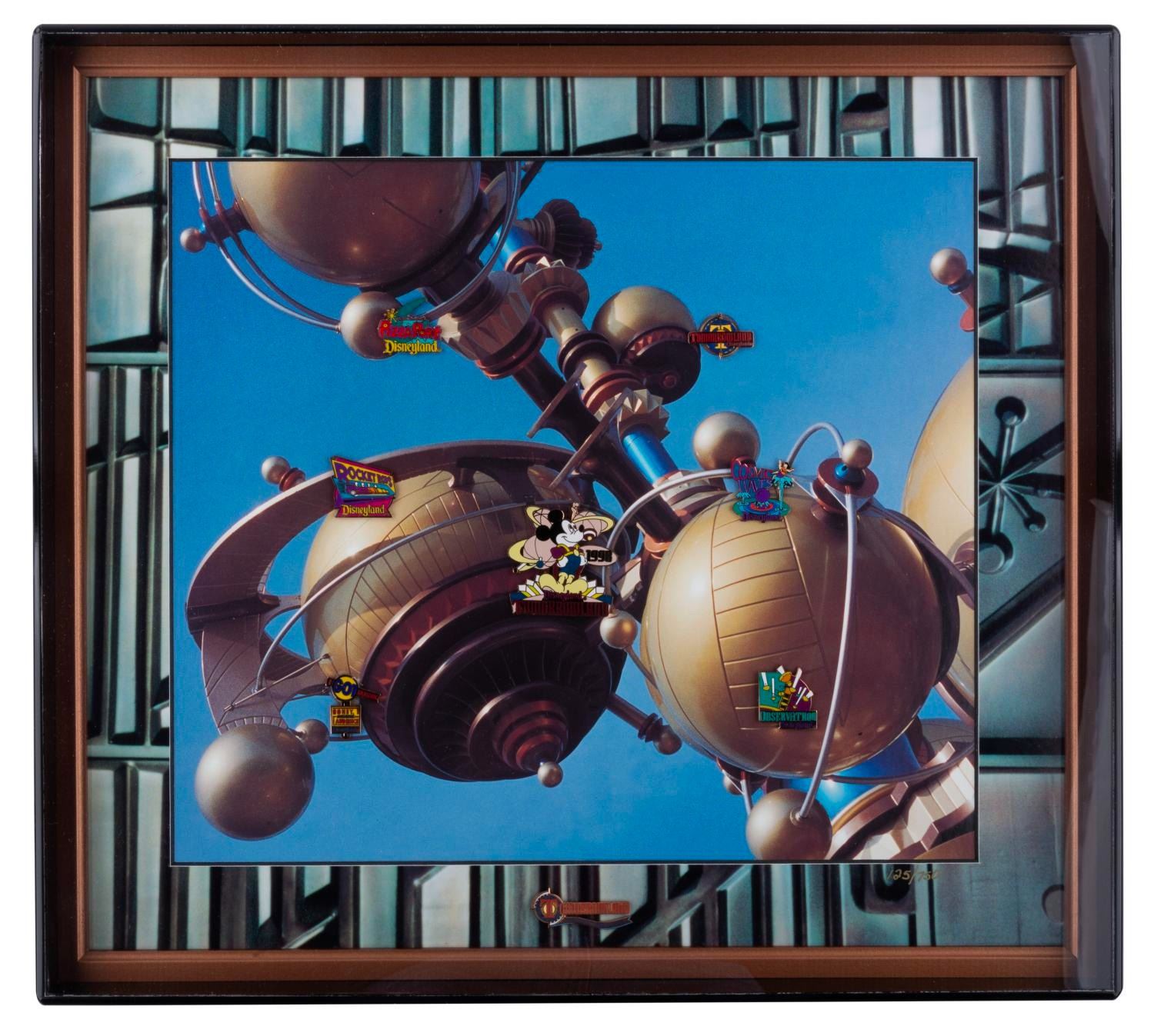 (Disneyland, 1998) An Imagination and Beyond New Tomorrowland 1998 commemorative eight-pin set including Tomorrowland 1998 Mickey Mouse, Pizza Port, New Tomorrowland logo, Cosmic Waves, Tomorrowland Imagination and Beyond, Rocket Rods, Observatron, and Honey, I Shrunk the Audience pins. Numbered 125 of an edition of 750, the 18.5” x 20.5” framed pin set is in very good condition with light scratches and wear.