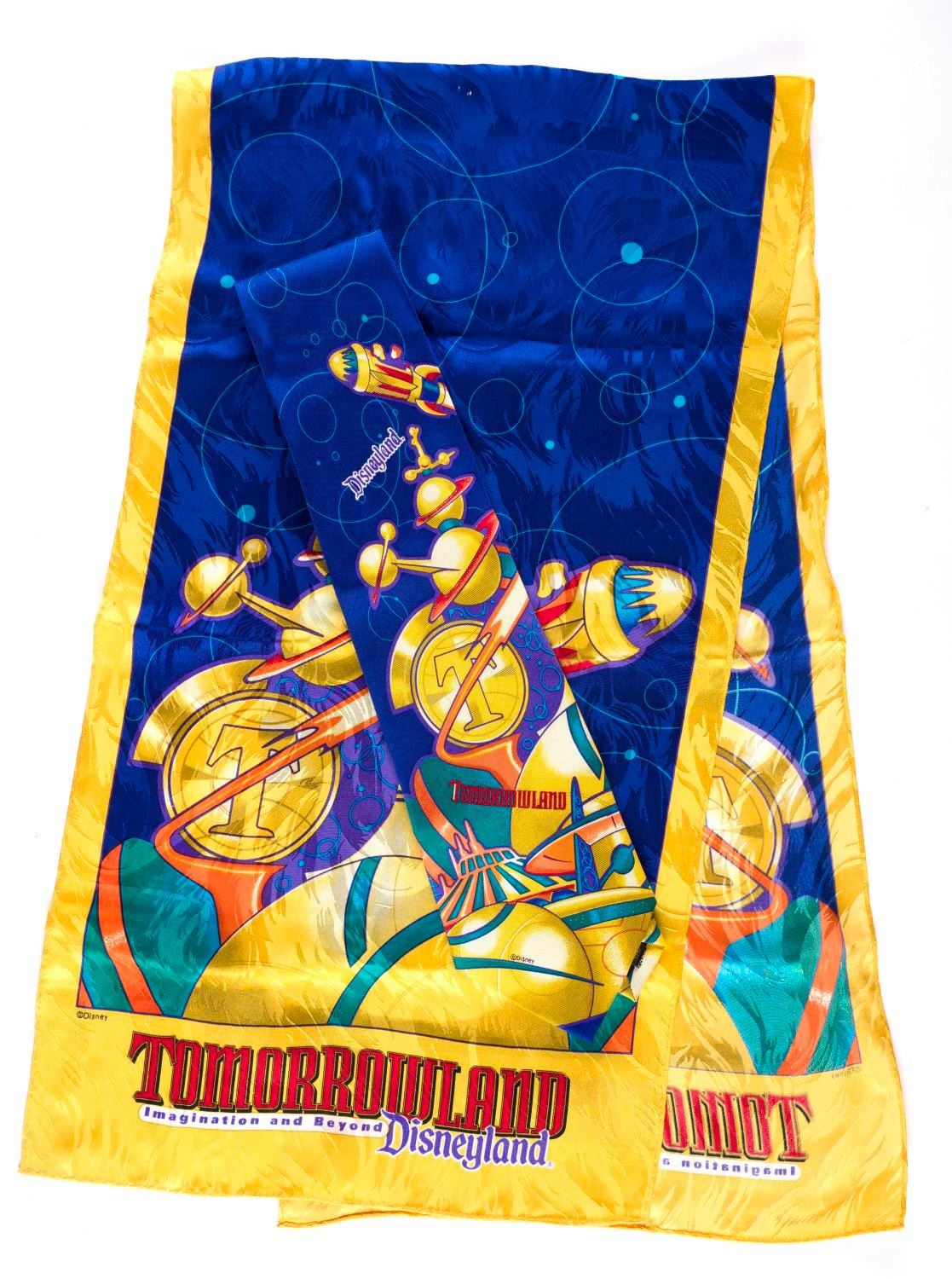 (Disneyland, 1998) A colorful New Tomorrowland Cast Member tie and scarf. The tie, measuring 28” long, and the scarf measuring 10.25” x 40”, are both in very good condition with light creases and wear.