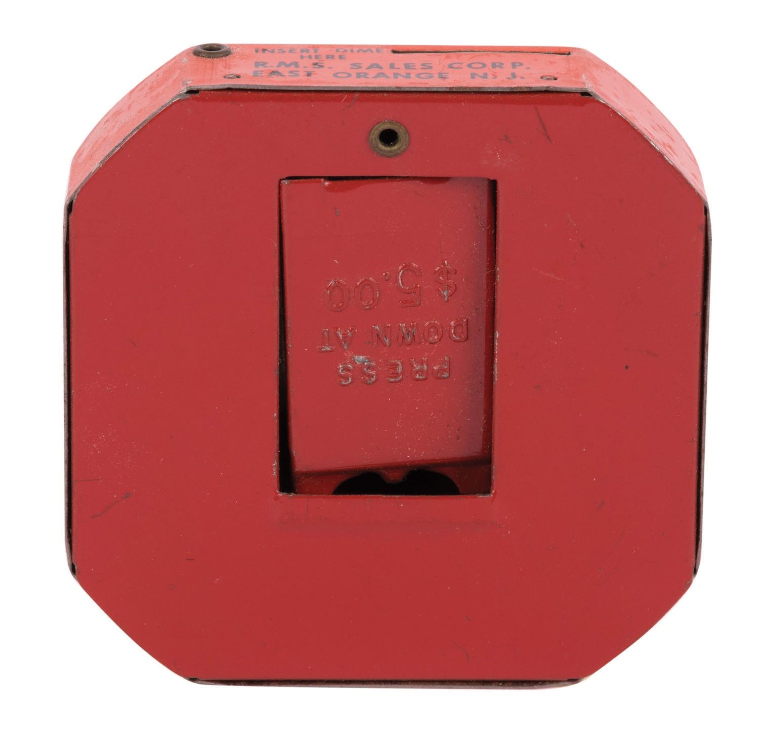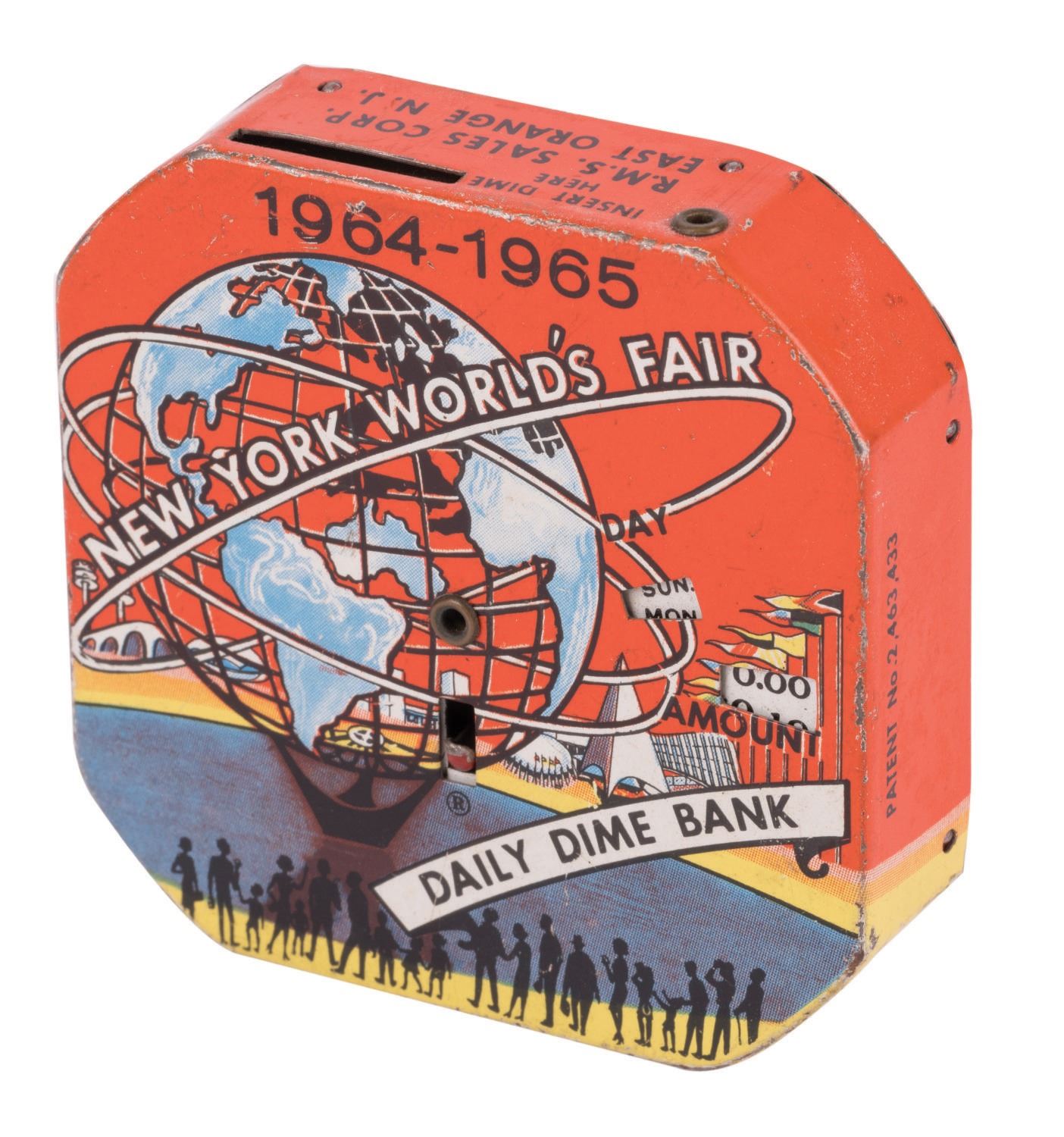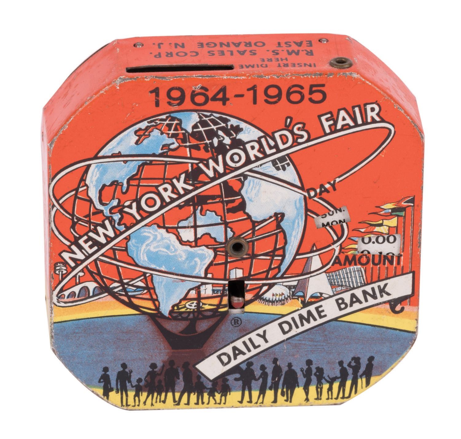 (World's Fair, 1964-54) A New York World's Fair Daily Dime Bank. The metallic bank features colorful imagery of the Unisphere and was manufactured by USS Steel and R.M.S. Sales Corp of East Orange. Measuring 2.75"x2.5", the bank is in very good condition with light paint loss, few scuffs, little wear to edges.