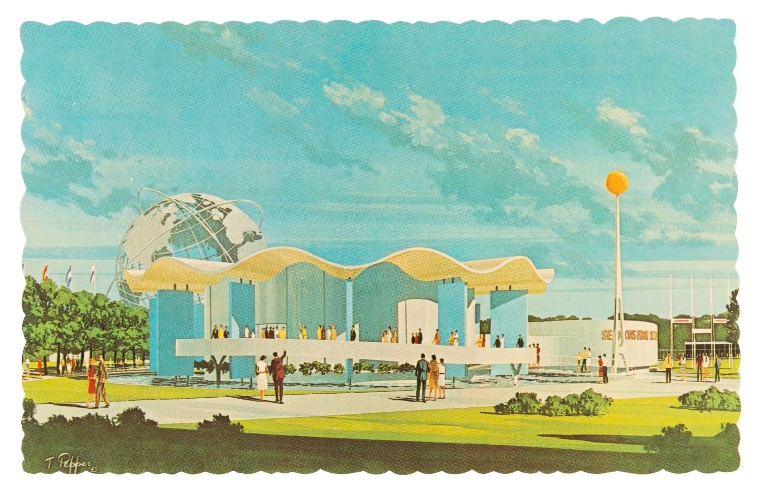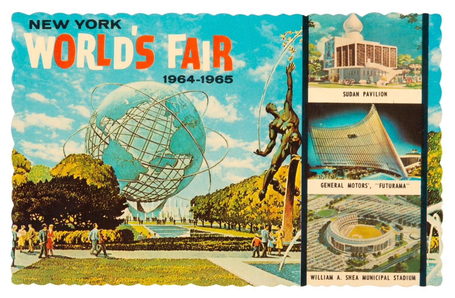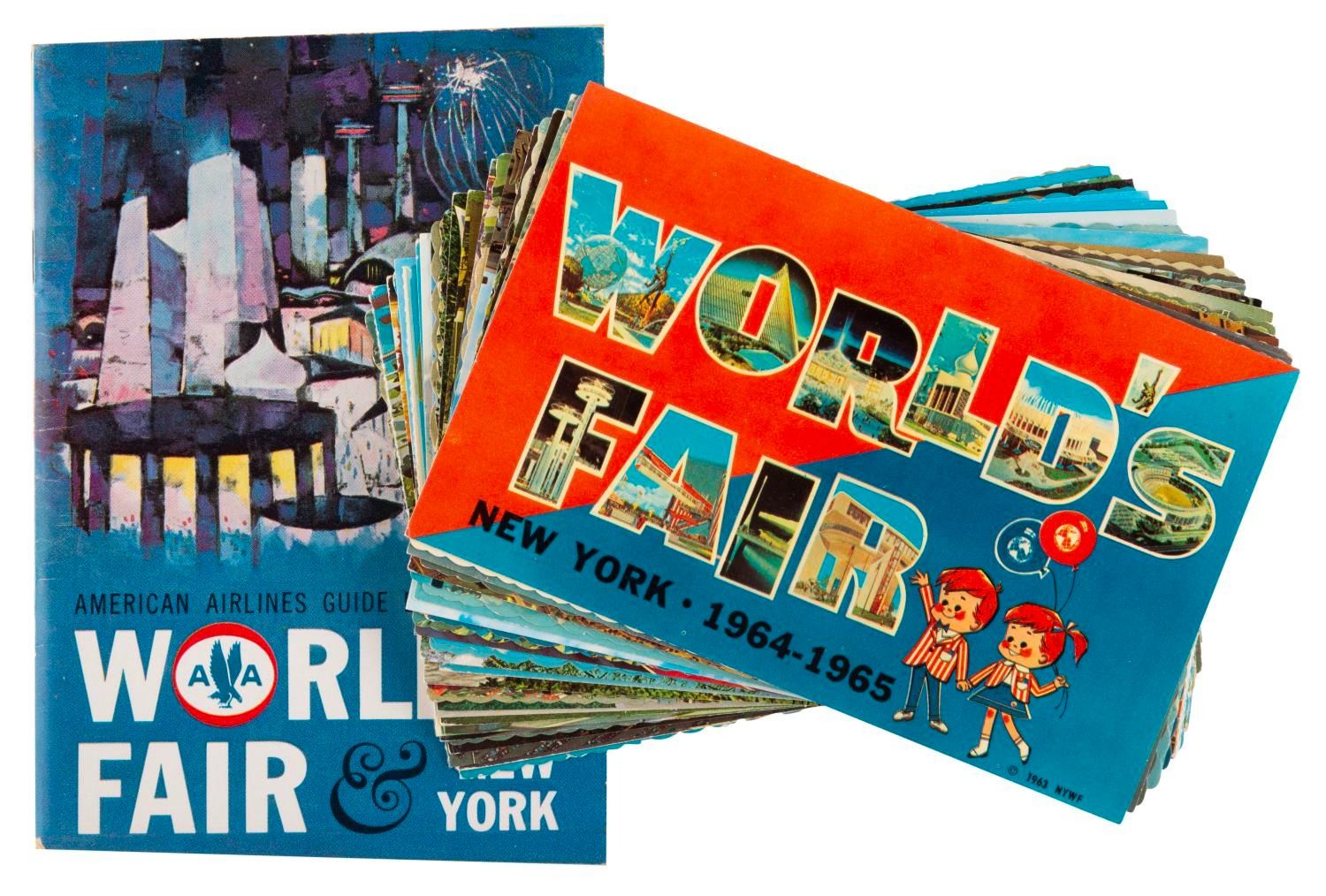 (World's Fair, 1964-65) A collection of 30 postcards and an American Airlines-sponsored guidebook from the 1964-65 New York World's Fair. The 3.75" x 5.5" postcards are in good condition with discoloration, and one written on. The 4" x 6" guidebook is in good condition with edge wear, creasing, and discoloration.