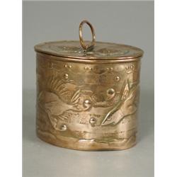 A Newlyn oval copper box decorated with fish and shells (stamped to base and lid), 13cm Est. 300/400