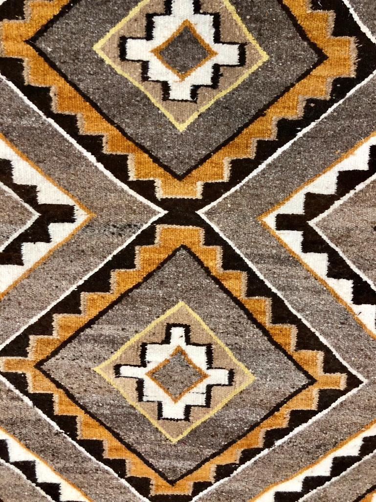 Offered for sale in this lot is a nicely woven Navajo textile featuring different shades of browns, whites and yellows in a double diamond pattern. An eye-catcher! Maker: Unknown Navajo weaver. Approx. Age: Fairly modern. Size: 33 inches wide X 39 inches long. Condition: Good for its age, minimal wear expected. Please look closely at the pictures - they are an important part of our description. Shipping: There will be a $5 handling / packaging fee for shipping this lot. The actual cost of postage will be added on top of that. BUY IT NOW: If you would like to buy this item now without waiting for the auction to end (this option is only available up to 48 hours before the auction starts to close), the “Buy it Now” price is the high estimate of this lot. If you would like to end the auction early and pay the high estimate (plus applicable fees), please contact us by phone or email and reference this lot number.