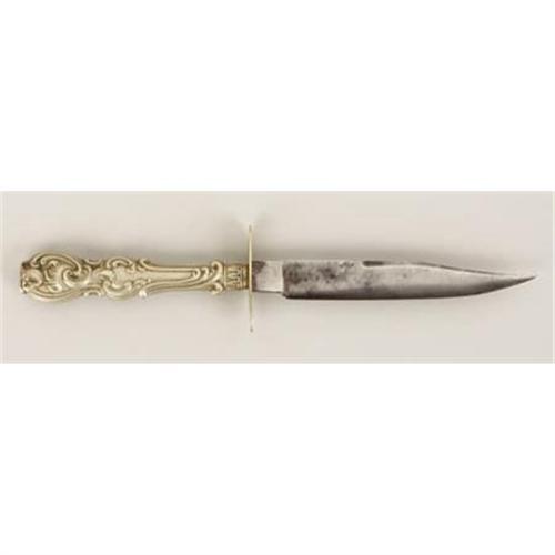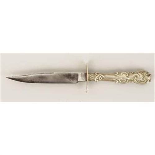 <B>A Nicholson Sheffield Side Knife.</B></I> In the style of the 1860's Sheffield tableware side knives, this Nicholson 5” bladed knife with its silver handle is in very good condition. The blade is stamped with the 'Broomhall Works' mark of Nicholson's factory, has some striations at the front edge toward the tip, but otherwise is in very good condition.<BR><BR><b>Shipping:</b> Flat Material, Small (<a target="_blank" href="http://www.heritageauctions.com/common/shipping.php">view shipping information</a>)