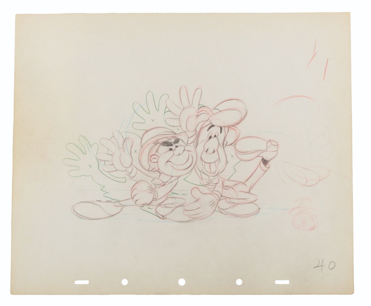 (Disney, 1941) An original production drawing of caricatures of Disney Legends Fred Moore and Ward Kimball from the animated short “Nifty Nineties.” The characters measure 5” x 7.5” on 10” x 12” animation paper. The graphite and color pencil drawing is in very good, production-used condition with light edge wear and creasing, and light discoloration from age.